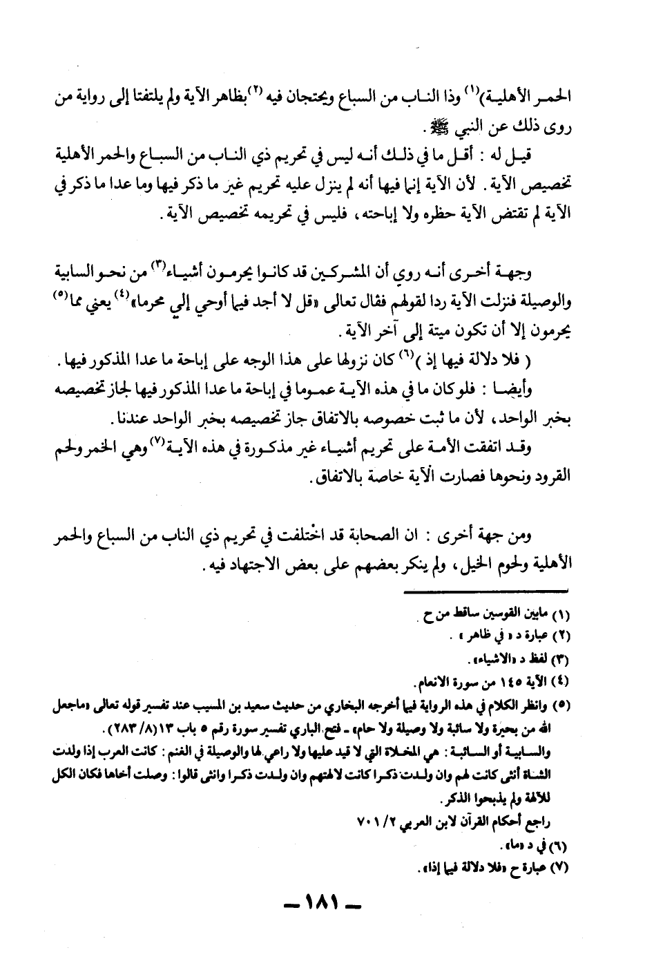 وَأَيْضًا: فَلَوْ كَانَ مَا فِي هَذِهِ الْآيَةِ عُمُومًا فِي إبَاحَةِ مَا عَدَا الْمَذْكُورَ فِيهَا لَجَازَ تَخْصِيصُهُ بِخَبَرِ الْوَاحِدِ، لِأَنَّ مَا ثَبَتَ خُصُوصُهُ بِالِاتِّفَاقِ جَازَ تَخْصِيصُهُ بِخَبَرِ الْوَاحِدِ عِنْدَنَا. وَقَدْ اتَّفَقَتْ الْأُمَّةُ عَلَى تَحْرِيمِ أَشْيَاءَ غَيْرِ مَذْكُورَةٍ فِي هَذِهِ الْآيَةِ وَهِيَ الْخَمْرُ وَلَحْمُ الْقُرُودِ وَنَحْوُهَا فَصَارَتْ الْآيَةُ خَاصَّةً بِالِاتِّفَاقِ. وَمِنْ جِهَةٍ أُخْرَى: أَنَّ الصَّحَابَةَ قَدْ اخْتَلَفَتْ فِي تَحْرِيمِ ذِي النَّابِ مِنْ السِّبَاعِ وَالْحُمُرِ الْأَهْلِيَّةِ وَلُحُومِ الْخَيْلِ، وَلَمْ يُنْكِرْ بَعْضُهُمْ عَلَى بَعْضٍ الِاجْتِهَادَ فِيهِ.