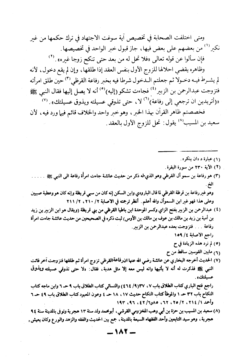 وَمَتَى اخْتَلَفَتْ الصَّحَابَةُ فِي تَخْصِيصِ آيَةِ سَوَّغَتْ الِاجْتِهَادَ فِي تَرْكِ حُكْمِهَا مِنْ غَيْرِ نَكِيرٍ مِنْ بَعْضِهِمْ عَلَى بَعْضٍ فِيهَا، جَازَ قَبُولُ خَبَرِ الْوَاحِدِ فِي تَخْصِيصِهَا. فَإِنْ سَأَلُوا عَنْ قَوْله تَعَالَى: {فَلَا تَحِلُّ لَهُ مِنْ بَعْدُ حَتَّى تَنْكِحَ زَوْجًا غَيْرَهُ} [البقرة: 230] . وَظَاهِرُهُ يَقْتَضِي إحْلَالَهَا لِلزَّوْجِ الْأَوَّلِ بِنَفْسِ الْعَقْدِ إذَا طَلَّقَهَا، وَإِنْ لَمْ يَقَعْ دُخُولٌ، لِأَنَّهُ لَمْ يَشْرِطْ فِيهِ دُخُولًا ثُمَّ جَعَلْتُمْ الدُّخُولَ شَرْطًا فِيهِ بِخَبَرِ رِفَاعَةَ الْقُرَظِيِّ حِينَ طَلَّقَ امْرَأَتَهُ فَتَزَوَّجَتْ عَبْدَ الرَّحْمَنِ بْنَ الزُّبَيْرِ فَجَاءَتْ تَشْكُو (إلَيْهِ) أَنَّهُ لَا يَصِلُ إلَيْهَا فَقَالَ النَّبِيُّ - صَلَّى اللَّهُ عَلَيْهِ وَسَلَّمَ - «أَتُرِيدِينَ أَنْ تَرْجِعِي إلَى رِفَاعَةَ لَا، حَتَّى تَذُوقِي عُسَيْلَتَهُ وَيَذُوقَ عُسَيْلَتَك» . فَخَصَصْتُمْ ظَاهِرَ الْقُرْآنِ بِهَذَا الْخَبَرِ، وَهُوَ خَبَرُ وَاحِدٍ وَالْخِلَافُ قَائِمٌ فِيمَا وَرَدَ فِيهِ، لِأَنَّ سَعِيدَ بْنَ الْمُسَيِّبِ يَقُولُ: تَحِلُّ لِلزَّوْجِ الْأَوَّلِ بِالْعَقْدِ.