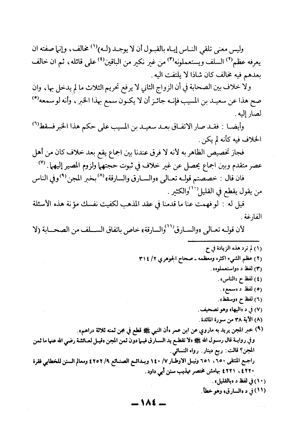 وَلَيْسَ مَعْنَى تَلَقِّي النَّاسِ إيَّاهُ بِالْقَبُولِ أَنْ لَا يُوجَدَ (لَهُ) مُخَالِفٌ، وَإِنَّمَا صِفَتُهُ أَنْ يَعْرِفَهُ عُظْمُ السَّلَفِ وَيَسْتَعْمِلُونَهُ مِنْ غَيْرِ نَكِيرٍ مِنْ الْبَاقِينَ عَلَى قَائِلِهِ، ثُمَّ إنْ خَالَفَ بَعْدَهُمْ فِيهِ مُخَالِفٌ كَانَ شَاذًّا لَا يُلْتَفَتُ إلَيْهِ. وَلَا خِلَافَ بَيْنَ الصَّحَابَةِ فِي أَنَّ الزَّوَاجَ الثَّانِيَ لَا يَرْفَعُ تَحْرِيمَ الثَّلَاثِ مَا لَمْ يَدْخُلْ بِهَا، وَإِنْ صَحَّ هَذَا عَنْ سَعِيدِ بْنِ الْمُسَيِّبِ فَإِنَّهُ جَائِزٌ أَنْ لَا يَكُونَ سَمِعَ بِهَذَا الْخَبَرِ، وَأَنَّهُ لَوْ سَمِعَهُ لَصَارَ إلَيْهِ. وَأَيْضًا: فَقَدْ صَارَ الِاتِّفَاقُ بَعْدَ سَعِيدِ بْنِ الْمُسَيِّبِ عَلَى حُكْمِ هَذَا الْخَبَرِ فَسَقَطَ الْخِلَافُ فِيهِ كَأَنَّهُ لَمْ يَكُنْ. فَجَازَ تَخْصِيصُ الظَّاهِرِ بِهِ لِأَنَّهُ لَا فَرْقَ عِنْدَنَا بَيْنَ إجْمَاعٍ يَقَعُ بَعْدَ خِلَافٍ كَانَ مِنْ أَهْلِ عَصْرٍ مُتَقَدِّمٍ وَبَيْنَ إجْمَاعٍ يَحْصُلُ عَنْ غَيْرِ خِلَافٍ فِي ثُبُوتِ حُجَّتِهِمَا وَلُزُومِ الْمَصِيرِ إلَيْهِمَا. فَإِنْ قَالَ: خَصَصْتُمْ قَوْله تَعَالَى {وَالسَّارِقُ وَالسَّارِقَةُ} [المائدة: 38] بِخَبَرِ الْمِجَنِّ وَفِي النَّاسِ مَنْ يَقُولُ يُقْطَعُ فِي الْقَلِيلِ وَالْكَثِيرِ. قِيلَ لَهُ: لَوْ فَهِمْت عَنَّا مَا قَدَّمْنَا فِي عَقْدِ الْمَذْهَبِ لَكَفَيْت نَفْسَك مُؤْنَةَ هَذِهِ الْأَسْئِلَةِ الْفَارِغَةِ. لِأَنَّ قَوْله تَعَالَى {وَالسَّارِقُ وَالسَّارِقَةُ} [المائدة: 38] خَاصٌّ بِاتِّفَاقِ السَّلَفِ مِنْ الصَّحَابَةِ (لَا)