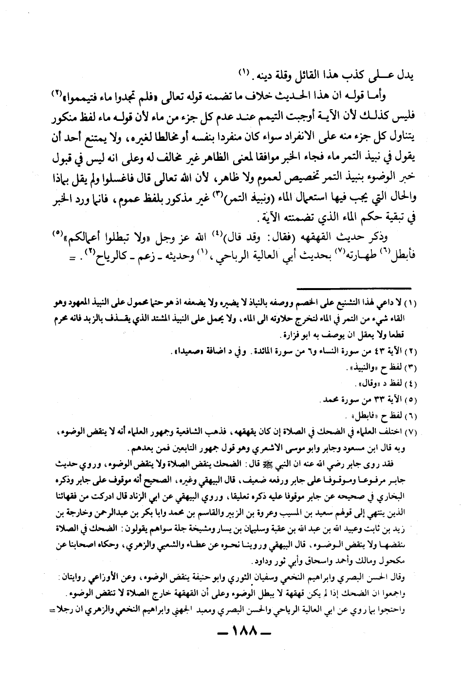 يَدُلُّ عَلَى كَذِبِ هَذَا الْقَائِلِ وَقِلَّةِ دِينِهِ وَأَمَّا قَوْلُهُ إنَّ هَذَا الْحَدِيثَ خِلَافُ مَا تَضَمَّنَهُ قَوْله تَعَالَى {فَلَمْ تَجِدُوا مَاءً فَتَيَمَّمُوا} [المائدة: 6] فَلَيْسَ كَذَلِكَ لِأَنَّ الْآيَةَ أَوْجَبَتْ التَّيَمُّمَ عِنْدَ عَدَمِ كُلِّ جُزْءٍ مِنْ مَاءٍ لِأَنَّ قَوْلَهُ {مَاءً} [المائدة: 6] لَفْظٌ مَنْكُورٌ يَتَنَاوَلُ كُلَّ جُزْءٍ مِنْهُ عَلَى الِانْفِرَادِ سَوَاءٌ كَانَ مُنْفَرِدًا بِنَفْسِهِ أَوْ مُخَالِطًا لِغَيْرِهِ، وَلَا يَمْتَنِعُ أَحَدٌ أَنْ يَقُولَ فِي نَبِيذِ التَّمْرِ مَاءٌ فَجَاءَ الْخَبَرُ مُوَافِقًا لِمَعْنَى الظَّاهِرِ غَيْرَ مُخَالِفٍ لَهُ وَعَلَى أَنَّهُ لَيْسَ فِي قَبُولِ خَبَرِ الْوُضُوءِ بِنَبِيذِ التَّمْرِ تَخْصِيصٌ لِعُمُومٍ وَلَا ظَاهِرٍ، لِأَنَّ اللَّهَ تَعَالَى قَالَ {فَاغْسِلُوا} [المائدة: 6] وَلَمْ يَقُلْ بِمَاذَا وَالْحَالُ الَّتِي يَجِبُ فِيهَا اسْتِعْمَالُ الْمَاءِ (وَنَبِيذُ التَّمْرِ) غَيْرُ مَذْكُورٍ بِلَفْظِ عُمُومٍ، فَإِنَّمَا وَرَدَ الْخَبَرُ فِي تَبْقِيَةِ حُكْمِ الْمَاءِ الَّذِي تَضَمَّنَتْهُ الْآيَةُ. وَذَكَرَ حَدِيثَ الْقَهْقَهَةِ (فَقَالَ: وَقَدْ قَالَ) اللَّهُ عَزَّ وَجَلَّ {وَلَا تُبْطِلُوا أَعْمَالَكُمْ} [محمد: 33] فَأَبْطَلَ طَهَارَتَهُ بِحَدِيثِ أَبِي الْعَالِيَةِ الرِّيَاحِيِّ، وَحَدِيثُهُ - زَعَمَ - كَالرِّيَاحِ.