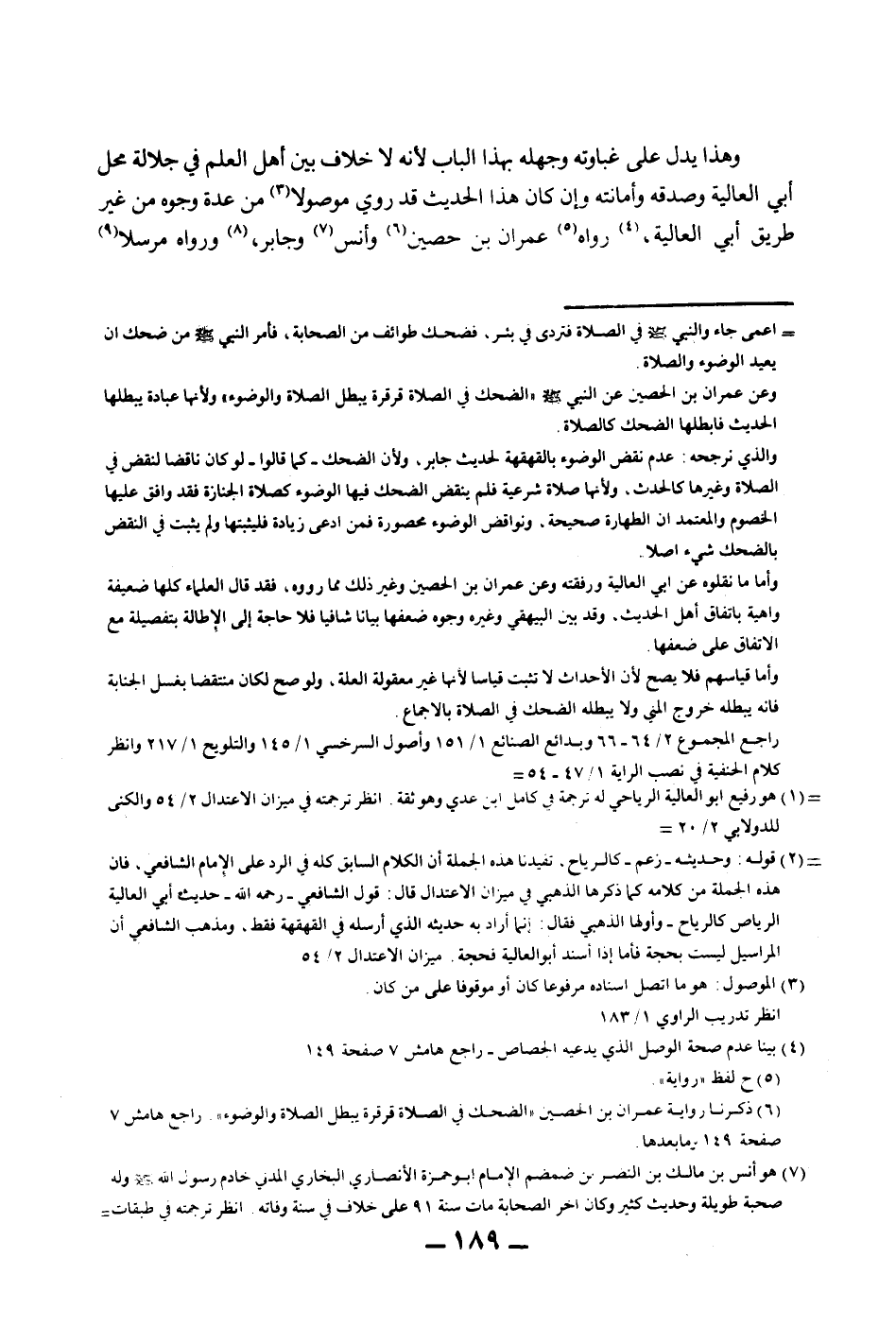 وَهَذَا يَدُلُّ عَلَى غَبَاوَتِهِ وَجَهْلِهِ بِهَذَا الْبَابِ لِأَنَّهُ لَا خِلَافَ بَيْنَ أَهْلِ الْعِلْمِ فِي جَلَالَةِ مَحَلِّ أَبِي الْعَالِيَةِ وَصِدْقِهِ وَأَمَانَتِهِ وَإِنْ كَانَ هَذَا الْحَدِيثُ قَدْ رُوِيَ مَوْصُولًا مِنْ عِدَّةِ وُجُوهٍ مِنْ غَيْرِ طَرِيقِ أَبِي الْعَالِيَةِ رَوَاهُ عِمْرَانُ بْنُ حُصَيْنٍ وَأَنَسٌ وَجَابِرٌ، وَرَوَاهُ مُرْسَلًا