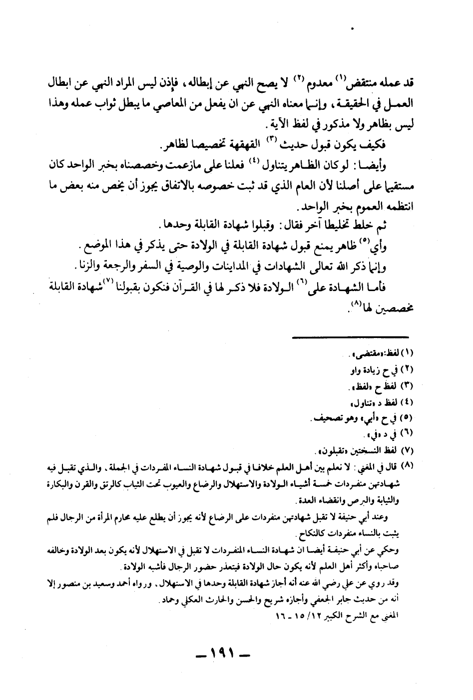 قَدْ عَمِلَهُ مُنْتَقِضٌ مَعْدُومٌ لَا يَصِحُّ النَّهْيُ عَنْ إبْطَالِهِ، فَإِذَنْ لَيْسَ الْمُرَادُ النَّهْيَ عَنْ إبْطَالِ الْعَمَلِ فِي الْحَقِيقَةِ، وَإِنَّمَا مَعْنَاهُ النَّهْيُ عَنْ أَنْ يَفْعَلَ مِنْ الْمَعَاصِي مَا يُبْطِلُ ثَوَابَ عَمَلِهِ وَهَذَا لَيْسَ بِظَاهِرٍ وَلَا مَذْكُورٍ فِي لَفْظِ الْآيَةِ. فَكَيْفَ يَكُونُ قَبُولُ حَدِيثِ الْقَهْقَهَةِ تَخْصِيصًا لِظَاهِرٍ. وَأَيْضًا: لَوْ كَانَ الظَّاهِرُ يَتَنَاوَلُ فِعْلَنَا عَلَى مَا زَعَمْت وَخَصَّصْنَاهُ بِخَبَرِ الْوَاحِدِ كَانَ مُسْتَقِيمًا عَلَى أَصْلِنَا لِأَنَّ الْعَامَّ الَّذِي قَدْ ثَبَتَ خُصُوصُهُ بِالِاتِّفَاقِ يَجُوزُ أَنْ يُخَصَّ مِنْهُ بَعْضُ مَا انْتَظَمَهُ الْعُمُومُ بِخَبَرِ الْوَاحِدِ. ثُمَّ خَلَّطَ تَخْلِيطًا آخَرَ فَقَالَ: وَقَبِلُوا شَهَادَةَ الْقَابِلَةِ وَحْدَهَا. وَأَيُّ ظَاهِرٍ يَمْنَعُ قَبُولَ شَهَادَةِ الْقَابِلَةِ فِي الْوِلَادَةِ حَتَّى يُذْكَرَ فِي هَذَا الْمَوْضِعِ. وَإِنَّمَا ذَكَرَ اللَّهُ تَعَالَى الشَّهَادَاتِ فِي الْمُدَايَنَاتِ وَالْوَصِيَّةِ فِي السَّفَرِ وَالرَّجْعَةِ وَالزِّنَا. فَأَمَّا الشَّهَادَةُ عَلَى الْوِلَادَةِ فَلَا ذِكْرَ لَهَا فِي الْقُرْآنِ فَنَكُونَ بِقَبُولِنَا شَهَادَةَ الْقَابِلَةِ مُخَصِّصِينَ لَهَا. .