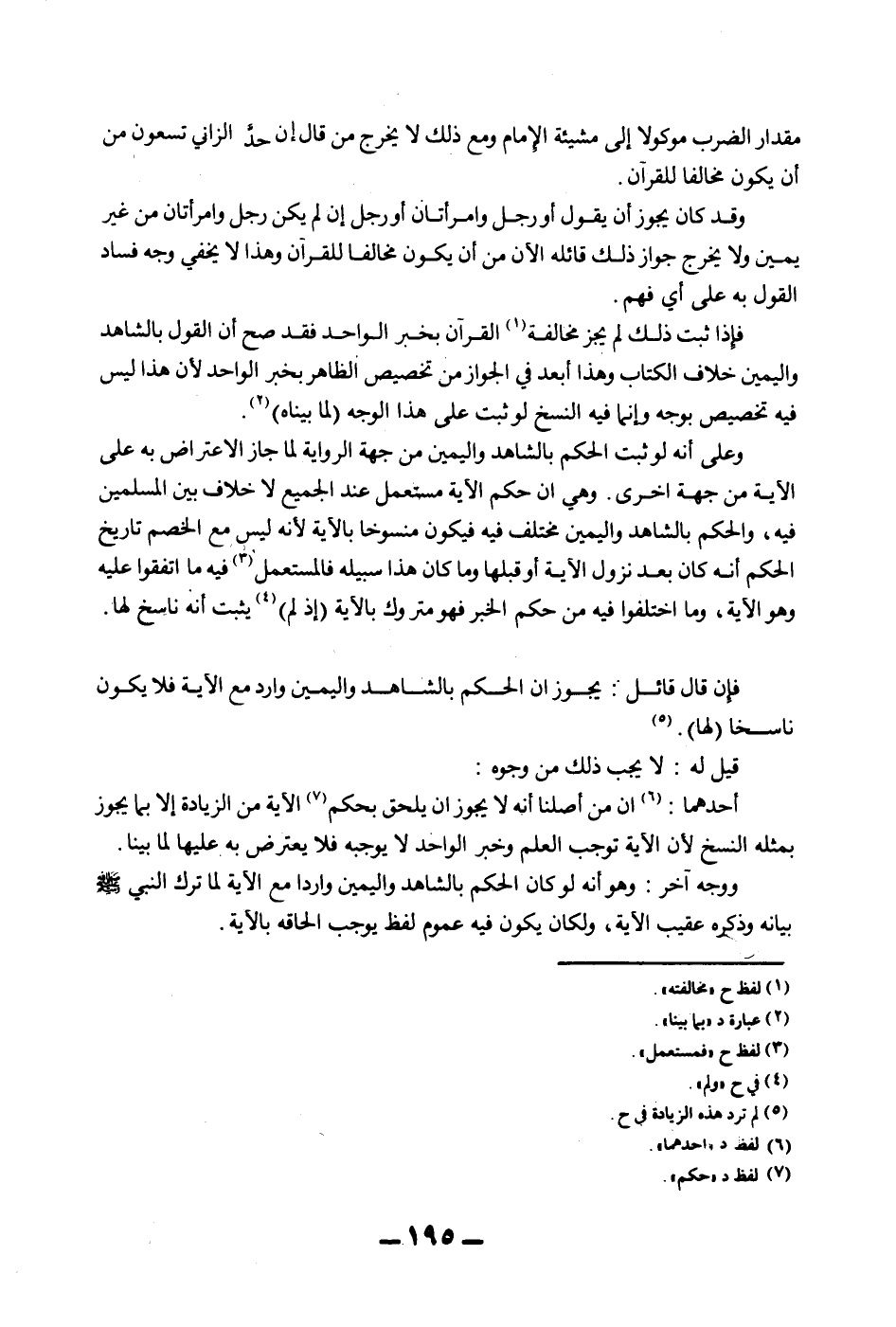 مِقْدَارُ الضَّرْبِ مَوْكُولًا إلَى مَشِيئَةِ الْإِمَامِ وَمَعَ ذَلِكَ لَا يَخْرُجُ مَنْ قَالَ إنَّ حَدَّ الزَّانِي تِسْعُونَ مِنْ أَنْ يَكُونَ مُخَالِفًا لِلْقُرْآنِ. وَقَدْ كَانَ يَجُوزُ أَنْ يَقُولَ أَوْ رَجُلٌ وَامْرَأَتَانِ أَوْ رَجُلٌ إنْ لَمْ يَكُنْ رَجُلٌ وَامْرَأَتَانِ مِنْ غَيْرِ يَمِينٍ وَلَا يُخْرِجُ جَوَازُ ذَلِكَ قَائِلَهُ الْآنَ مِنْ أَنْ يَكُونَ مُخَالِفًا لِلْقُرْآنِ وَهَذَا لَا يُخْفِي وَجْهَ فَسَادِ الْقَوْلِ بِهِ عَلَى أَيِّ فَهْمٍ.