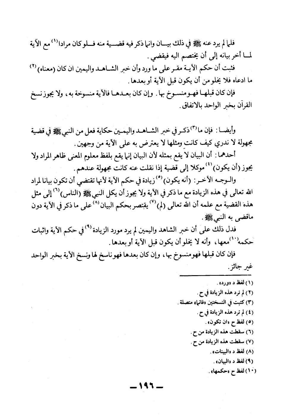 وَلَا يَجُوزُ نَسْخُ الْقُرْآنِ بِخَبَرِ الْوَاحِدِ بِالِاتِّفَاقِ. وَأَيْضًا: فَإِنَّ مَا ذُكِرَ فِي خَبَرِ الشَّاهِدِ وَالْيَمِينِ حِكَايَةُ فِعْلٍ مِنْ النَّبِيِّ - صَلَّى اللَّهُ عَلَيْهِ وَسَلَّمَ - فِي قَضِيَّةٍ مَجْهُولَةٍ لَا نَدْرِي كَيْفَ كَانَتْ وَمِثْلُهَا لَا يُعْتَرَضُ بِهِ عَلَى الْآيَةِ مِنْ وَجْهَيْنِ. أَحَدُهُمَا: أَنَّ الْبَيَانَ لَا يَقَعُ بِمِثْلِهِ لِأَنَّ الْبَيَانَ إنَّمَا يَقَعُ بِلَفْظٍ مَعْلُومِ الْمَعْنَى ظَاهِرِ الْمُرَادِ وَلَا يَجُوزُ (أَنْ يَكُونَ) مُوَكَّلًا إلَى قَضِيَّةٍ إذَا نُقِلَتْ عَنْهُ كَانَتْ مَجْهُولَةً عِنْدَهُمْ. وَالْوَجْهُ الْآخَرُ: (أَنَّهُ يَكُونُ) زِيَادَةً فِي حُكْمِ الْآيَةِ لِأَنَّهَا تَقْتَضِي أَنْ تَكُونَ بَيَانًا لِمُرَادِ اللَّهِ تَعَالَى فِي هَذِهِ الزِّيَادَةِ مَعَ مَا ذُكِرَ فِي الْآيَةِ وَلَا يَجُوزُ أَنْ يَكِلَ النَّبِيُّ - صَلَّى اللَّهُ عَلَيْهِ وَسَلَّمَ - (النَّاسَ) إلَى مِثْلِ هَذِهِ الْقَضِيَّةِ مَعَ عِلْمِهِ أَنَّ اللَّهَ تَعَالَى (لَمْ) يَقْتَصِرْ بِحُكْمِ الْبَيَانِ عَلَى مَا ذُكِرَ فِي الْآيَةِ دُونَ مَا قَضَى بِهِ النَّبِيُّ - صَلَّى اللَّهُ عَلَيْهِ وَسَلَّمَ -. فَدَلَّ ذَلِكَ عَلَى أَنَّ خَبَرَ الشَّاهِدِ وَالْيَمِينِ لَمْ يَرِدْ مَوْرِدَ الزِّيَادَةِ فِي حُكْمِ الْآيَةِ وَإِثْبَاتِ حُكْمِهِ مَعَهَا، وَأَنَّهُ لَا يَخْلُو أَنْ يَكُونَ قَبْلَ الْآيَةِ أَوْ بَعْدَهَا. فَإِنْ كَانَ قَبْلَهَا فَهُوَ مَنْسُوخٌ بِهَا، وَإِنْ كَانَ بَعْدَهَا فَهُوَ نَاسِخٌ لَهَا وَنَسْخُ الْآيَةِ بِخَبَرِ الْوَاحِدِ غَيْرُ جَائِزٍ.