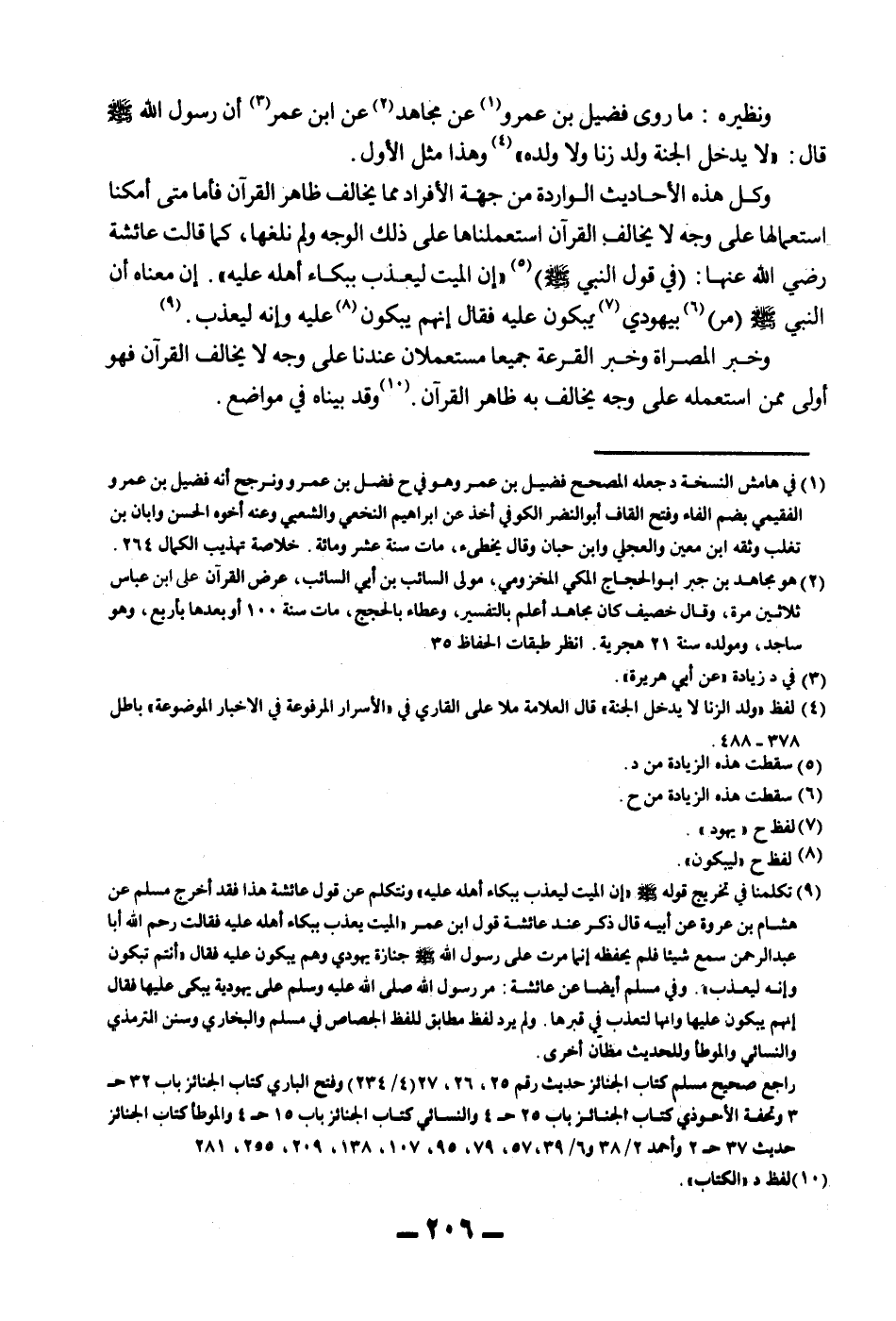 وَنَظِيرُهُ: مَا رَوَى فُضَيْلُ بْنُ عَمْرٍو عَنْ مُجَاهِدٍ عَنْ ابْنِ عُمَرَ أَنَّ رَسُولَ اللَّهِ - صَلَّى اللَّهُ عَلَيْهِ وَسَلَّمَ - قَالَ «لَا يَدْخُلُ الْجَنَّةَ وَلَدُ زِنًا وَلَا وَلَدُهُ» وَهَذَا مِثْلُ الْأَوَّلِ. وَكُلُّ هَذِهِ الْأَحَادِيثِ الْوَارِدَةِ مِنْ جِهَةِ الْأَفْرَادِ مِمَّا يُخَالِفُ ظَاهِرَ الْقُرْآنِ فَأَمَّا مَتَى أَمْكَنَّا اسْتِعْمَالُهَا عَلَى وَجْهٍ لَا يُخَالِفُ الْقُرْآنَ اسْتَعْمَلْنَاهَا عَلَى ذَلِكَ الْوَجْهِ وَلَمْ نُلْغِهَا، كَمَا قَالَتْ عَائِشَةُ - رَضِيَ اللَّهُ عَنْهَا -: فِي قَوْلِ النَّبِيِّ - صَلَّى اللَّهُ عَلَيْهِ وَسَلَّمَ - «إنَّ الْمَيِّتَ لَيُعَذَّبُ بِبُكَاءِ أَهْلِهِ عَلَيْهِ» .