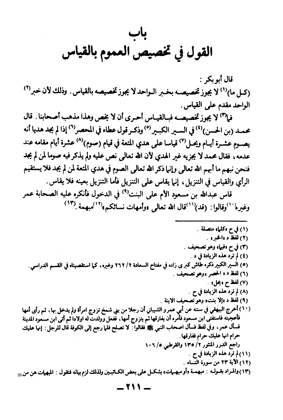قَالَ أَبُو بَكْرٍ: (كُلُّ مَا) لَا يَجُوزُ تَخْصِيصُهُ بِخَبَرِ الْوَاحِدِ لَا يَجُوزُ تَخْصِيصُهُ بِالْقِيَاسِ. وَذَلِكَ لِأَنَّ خَبَرَ الْوَاحِدِ مُقَدَّمٌ عَلَى الْقِيَاسِ. فَمَا لَا يَجُوزُ تَخْصِيصُهُ فَبِالْقِيَاسِ أَحْرَى أَنْ لَا يُخَصَّ وَهَذَا مَذْهَبُ أَصْحَابِنَا. قَالَ مُحَمَّدُ (بْنُ الْحَسَنِ) فِي السِّيَرِ الْكَبِيرِ وَذَكَرَ قَوْلَ عَطَاءٍ فِي الْمُحْصَرِ إذَا لَمْ يَجِدْ هَدْيًا أَنَّهُ يَصُومُ عَشَرَةَ أَيَّامٍ وَيَحِلُّ قِيَاسًا عَلَى هَدْيِ الْمُتْعَةِ فِي قِيَامِ (صَوْمِ) عَشَرَةِ أَيَّامٍ مَقَامَهُ عِنْدَ عَدَمِهِ، فَقَالَ مُحَمَّدٌ لَا يُجْزِيهِ غَيْرُ الْهَدْيِ لِأَنَّ اللَّهَ تَعَالَى نَصَّ عَلَيْهِ وَلَمْ يَذْكُرْ فِيهِ صَوْمًا لِمَنْ لَمْ يَجِدْ فَنَحْنُ نُبْهِمُ مَا أَبْهَمَ اللَّهُ تَعَالَى وَإِنَّمَا ذَكَرَ اللَّهُ تَعَالَى الصَّوْمَ فِي هَدْيِ الْمُتْعَةِ لِمَنْ لَمْ يَجِدْ فَلَا يَسْتَقِيمُ الرَّأْيُ وَالْقِيَاسُ فِي التَّنْزِيلِ، إنَّمَا يُقَاسُ عَلَى التَّنْزِيلِ فَأَمَّا التَّنْزِيلُ بِعَيْنِهِ فَلَا يُقَاسُ. قَاسَ عَبْدُ اللَّهِ بْنُ مَسْعُودٍ الْأُمَّ عَلَى الْبِنْتِ فِي الدُّخُولِ فَأَنْكَرَهُ عَلَيْهِ الصَّحَابَةُ عُمَرُ وَغَيْرُهُ وَقَالُوا: (قَدْ) قَالَ اللَّهُ تَعَالَى {وَأُمَّهَاتُ نِسَائِكُمْ} [النساء: 23] مُبْهَمَةٌ.