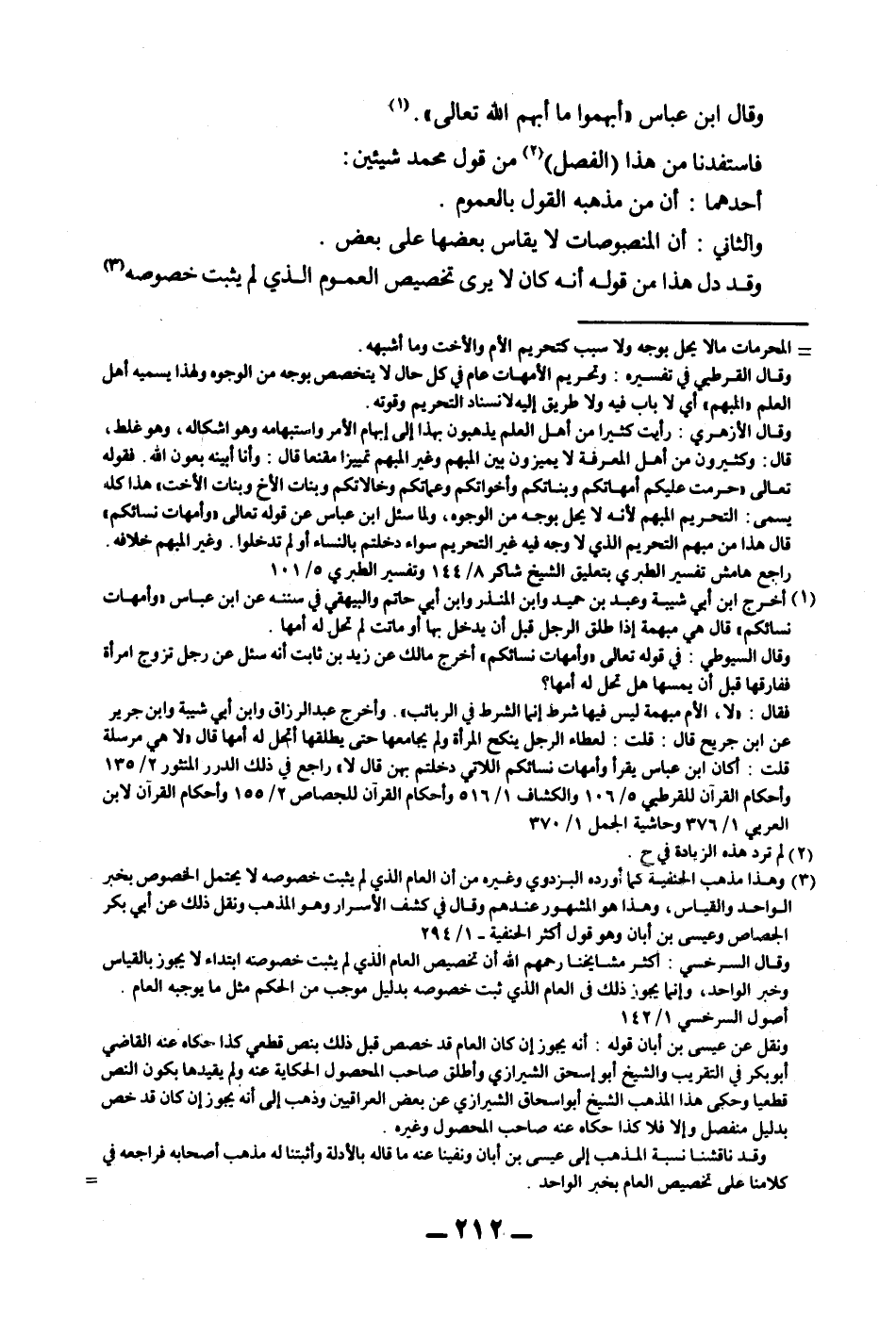 فَاسْتَفَدْنَا مِنْ هَذَا (الْفَصْلِ) مِنْ قَوْلِ مُحَمَّدٍ شَيْئَيْنِ: أَحَدُهُمَا: أَنَّ مِنْ مَذْهَبِهِ الْقَوْلَ بِالْعُمُومِ.