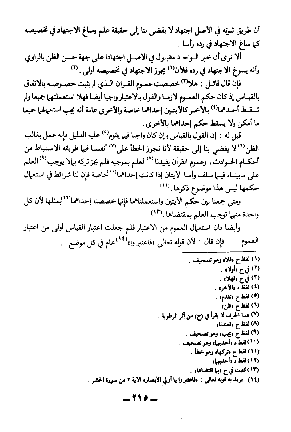 وَأَمَّا الْآيَتَانِ إذَا كَانَتْ إحْدَاهُمَا خَاصَّةً فَإِنَّ لَنَا شَرَائِطَ فِي اسْتِعْمَالِ حُكْمِهَا لَيْسَ هَذَا مَوْضُوعَ ذِكْرِهَا. وَمَتَى جَمَعْنَا بَيْنَ حُكْمِ الْآيَتَيْنِ وَاسْتَعْمَلْنَاهُمَا فَإِنَّمَا خَصَّصْنَا إحْدَاهُمَا بِمِثْلِهَا لِأَنَّ كُلَّ وَاحِدَةٍ مِنْهُمَا تُوجِبُ الْعِلْمَ بِمُقْتَضَاهَا. وَأَيْضًا فَإِنَّ اسْتِعْمَالَ الْعُمُومِ مِنْ الِاعْتِبَارِ فَلِمَ جَعَلْت اعْتِبَارَ الْقِيَاسِ أَوْلَى مِنْ اعْتِبَارِ الْعُمُومِ. فَإِنْ قَالَ: لِأَنَّ قَوْله تَعَالَى {فَاعْتَبِرُوا} [الحشر: 2] عَامٌّ فِي كُلِّ مَوْضِعٍ.
