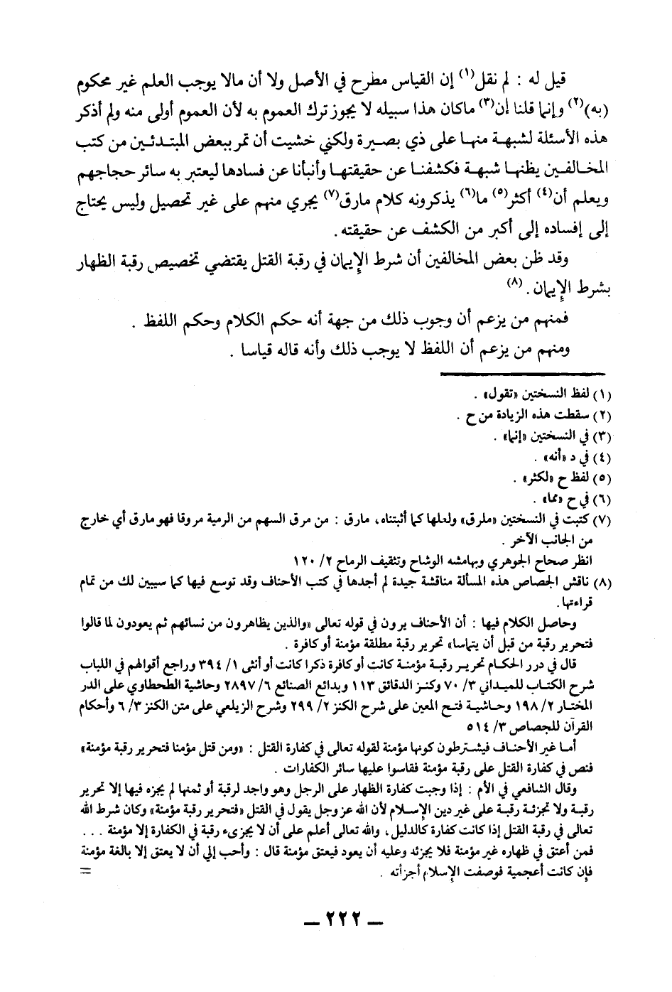 وَقَدْ ظَنَّ بَعْضُ الْمُخَالِفِينَ أَنَّ شَرْطَ الْإِيمَانِ فِي رَقَبَةِ الْقَتْلِ يَقْتَضِي تَخْصِيصَ رَقَبَةِ الظِّهَارِ بِشَرْطِ الْإِيمَانِ. فَمِنْهُمْ مَنْ يَزْعُمُ أَنَّ وُجُوبَ ذَلِكَ مِنْ جِهَةِ أَنَّهُ حُكْمُ الْكَلَامِ وَحُكْمُ اللَّفْظِ. وَمِنْهُمْ مَنْ يَزْعُمُ أَنَّ اللَّفْظَ لَا يُوجِبُ ذَلِكَ وَأَنَّهُ قَالَهُ قِيَاسًا.