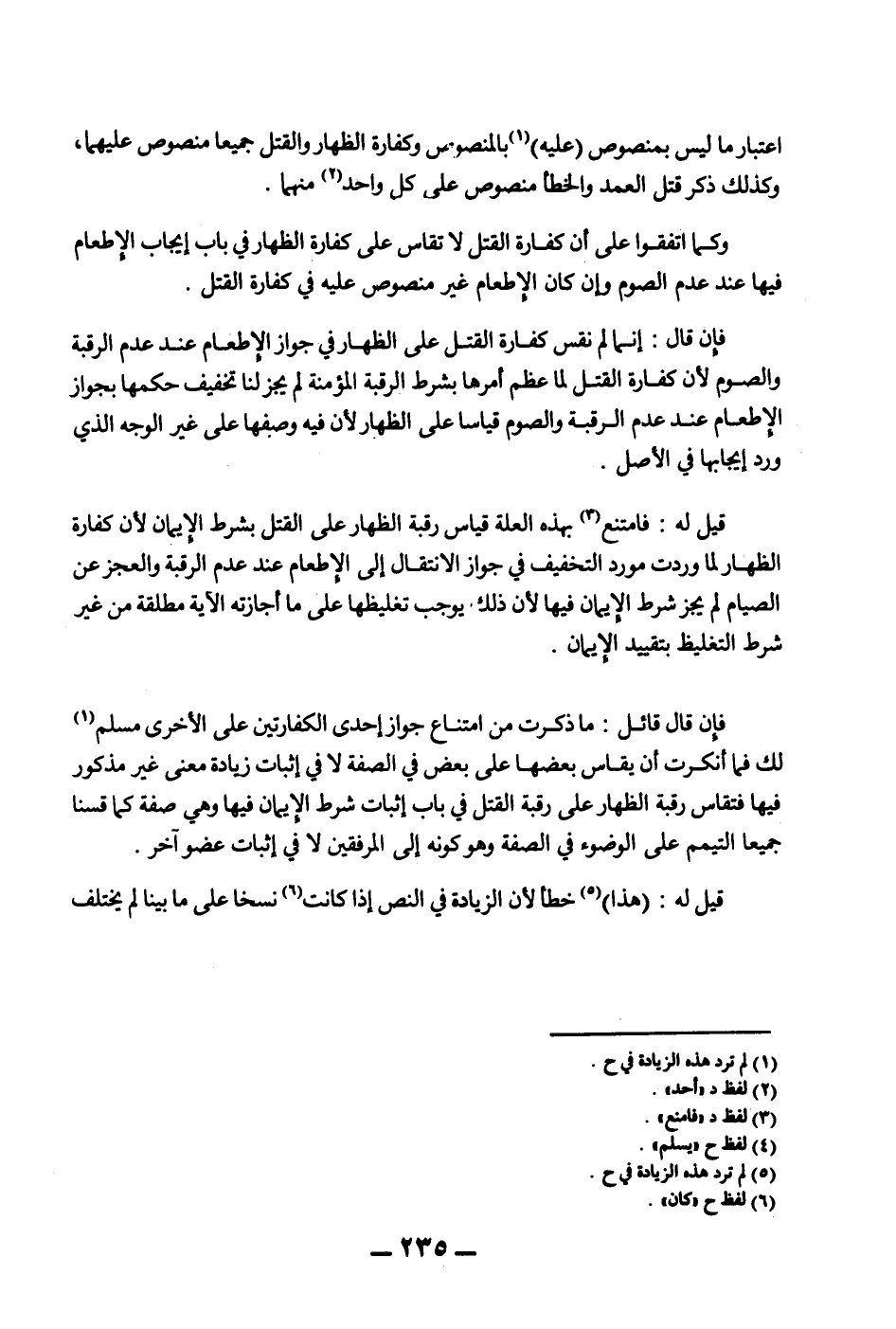 اعْتِبَارُ مَا لَيْسَ بِمَنْصُوصٍ (عَلَيْهِ) بِالْمَنْصُوصِ وَكَفَّارَةُ الظِّهَارِ وَالْقَتْلِ جَمِيعًا مَنْصُوصٌ عَلَيْهِمَا، وَكَذَلِكَ ذِكْرُ قَتْلِ الْعَمْدِ وَالْخَطَأِ مَنْصُوصٌ عَلَى كُلِّ وَاحِدٍ مِنْهُمَا. وَكَمَا اتَّفَقُوا عَلَى أَنَّ كَفَّارَةَ الْقَتْلِ لَا تُقَاسُ عَلَى كَفَّارَةِ الظِّهَارِ فِي بَابِ إيجَابِ الْإِطْعَامِ فِيهَا عِنْدَ عَدَمِ الصَّوْمِ، وَإِنْ كَانَ الْإِطْعَامُ غَيْرَ مَنْصُوصٍ عَلَيْهِ فِي كَفَّارَةِ الْقَتْلِ.