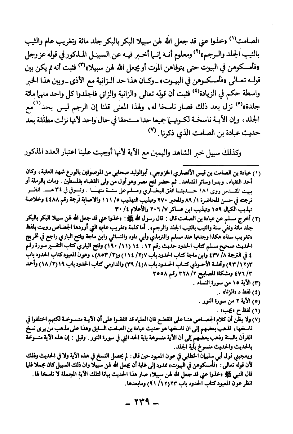 «خُذُوا عَنِّي قَدْ جَعَلَ اللَّهُ لَهُنَّ سَبِيلًا الْبِكْرُ بِالْبِكْرِ جَلْدُ مِائَةٍ وَتَغْرِيبُ عَامٍ وَالثَّيِّبُ بِالثَّيِّبِ الْجَلْدُ وَالرَّجْمُ» وَمَعْلُومٌ أَنَّهُ إنَّمَا أَخْبَرَ فِيهِ عَنْ السَّبِيلِ الْمَذْكُورِ فِي قَوْلِهِ عَزَّ وَجَلَّ {فَأَمْسِكُوهُنَّ فِي الْبُيُوتِ حَتَّى يَتَوَفَّاهُنَّ الْمَوْتُ أَوْ يَجْعَلَ اللَّهُ لَهُنَّ سَبِيلًا} [النساء: 15] فَثَبَتَ أَنَّهُ لَمْ يَكُنْ بَيْنَ قَوْله تَعَالَى {فَأَمْسِكُوهُنَّ فِي الْبُيُوتِ} [النساء: 15]- وَكَانَ هَذَا حَدَّ الزَّانِيَةِ مَعَ الْأَذَى - وَبَيْنَ هَذَا الْخَبَرِ وَاسِطَةٌ حُكِمَ فِي الزِّيَادَةِ فَثَبَتَ أَنَّ قَوْله تَعَالَى: {الزَّانِيَةُ وَالزَّانِي فَاجْلِدُوا كُلَّ وَاحِدٍ مِنْهُمَا مِائَةَ جَلْدَةٍ} [النور: 2] نَزَلَ بَعْدَ ذَلِكَ فَصَارَ نَاسِخًا لَهُ، وَلِهَذَا الْمَعْنَى قُلْنَا إنَّ الرَّجْمَ لَيْسَ بِحَدٍّ مَعَ الْجَلْدِ، وَإِنَّ الْآيَةَ نَاسِخَةٌ لِكَوْنِهِمَا جَمِيعًا حَدًّا مُسْتَحَقًّا فِي حَالٍ وَاحِدٍ لِأَنَّهَا نَزَلَتْ مُطْلَقَةً بَعْدَ حَدِيثِ عُبَادَةَ بْنِ الصَّامِتِ الَّذِي ذَكَرْنَا.