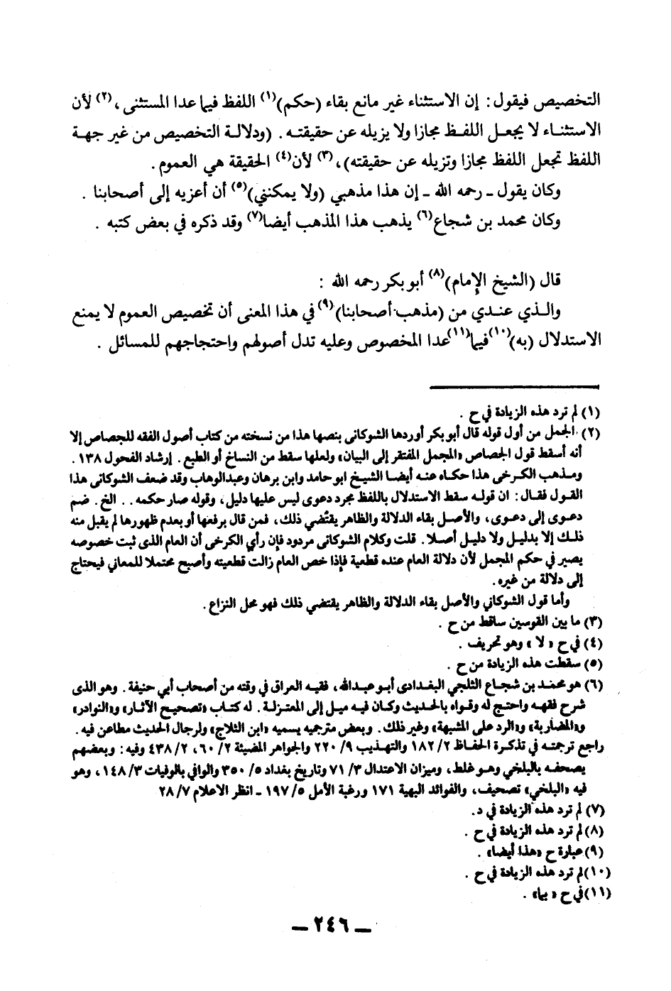 التَّخْصِيصَ فَيَقُولُ: إنَّ الِاسْتِثْنَاءَ غَيْرُ مَانِعٍ بَقَاءَ (حُكْمِ) اللَّفْظِ فِيمَا عَدَا الْمُسْتَثْنَى، لِأَنَّ الِاسْتِثْنَاءَ لَا يَجْعَلُ اللَّفْظَ مَجَازًا وَلَا يُزِيلُهُ عَنْ حَقِيقَتِهِ. (وَدَلَالَةُ التَّخْصِيصِ مِنْ غَيْرِ جِهَةِ اللَّفْظِ تَجْعَلُ اللَّفْظَ مَجَازًا وَتُزِيلُهُ عَنْ حَقِيقَتِهِ) ، لِأَنَّ الْحَقِيقَةَ هِيَ الْعُمُومُ. وَكَانَ يَقُولُ - رَحِمَهُ اللَّهُ - إنَّ هَذَا مَذْهَبِي (وَلَا يُمْكِنُنِي) أَنْ أَعْزِيَهُ إلَى أَصْحَابِنَا. وَكَانَ مُحَمَّدُ بْنُ شُجَاعٍ يَذْهَبُ هَذَا الْمَذْهَبَ أَيْضًا وَقَدْ ذَكَرَهُ فِي بَعْضِ كُتُبِهِ. قَالَ (الشَّيْخُ الْإِمَامُ) أَبُو بَكْرٍ - رَحِمَهُ اللَّهُ -: وَاَلَّذِي عِنْدِي مِنْ (مَذْهَبِ أَصْحَابِنَا) فِي هَذَا الْمَعْنَى أَنَّ تَخْصِيصَ الْعُمُومِ لَا يَمْنَعُ الِاسْتِدْلَالَ (بِهِ) فِيمَا عَدَا الْمَخْصُوصَ وَعَلَيْهِ تَدُلُّ أُصُولُهُمْ وَاحْتِجَاجُهُمْ لِلْمَسَائِلِ.
