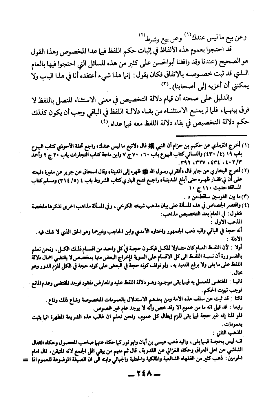 وَعَنْ بَيْعِ مَا لَيْسَ عِنْدَك وَعَنْ بَيْعٍ وَشَرْطٍ» قَدْ احْتَجُّوا بِعُمُومِ هَذِهِ الْأَلْفَاظِ فِي إثْبَاتِ حُكْمِ اللَّفْظِ فِيمَا عَدَا الْمَخْصُوصَ وَهَذَا الْقَوْلُ هُوَ الصَّحِيحُ (عِنْدَنَا وَقَدْ وَافَقَنَا أَبُو الْحَسَنِ عَلَى كَثِيرٍ مِنْ هَذِهِ الْمَسَائِلِ الَّتِي احْتَجُّوا فِيهَا بِالْعَامِّ الَّذِي قَدْ ثَبَتَ خُصُوصُهُ بِالِاتِّفَاقِ فَكَانَ يَقُولُ: إنَّمَا هَذَا شَيْءٌ أَعْتَقِدُهُ أَنَا فِي هَذَا الْبَابِ وَلَا يُمْكِنُنِي أَنْ أَعْزِيهِ إلَى أَصْحَابِنَا) . وَالدَّلِيلُ عَلَى صِحَّتِهِ أَنَّ قِيَامَ دَلَالَةِ التَّخْصِيصِ فِي مَعْنَى الِاسْتِثْنَاءِ الْمُتَّصِلِ بِاللَّفْظِ لَا فَرْقَ بَيْنَهُمَا، فَلَمَّا لَمْ يَمْنَعْ الِاسْتِثْنَاءُ مِنْ بَقَاءِ دَلَالَةِ اللَّفْظِ فِي الْبَاقِي وَجَبَ أَنْ يَكُونَ كَذَلِكَ حُكْمُ دَلَالَةِ التَّخْصِيصِ فِي بَقَاءِ دَلَالَةِ اللَّفْظِ مَعَهُ فِيمَا عَدَاهُ.