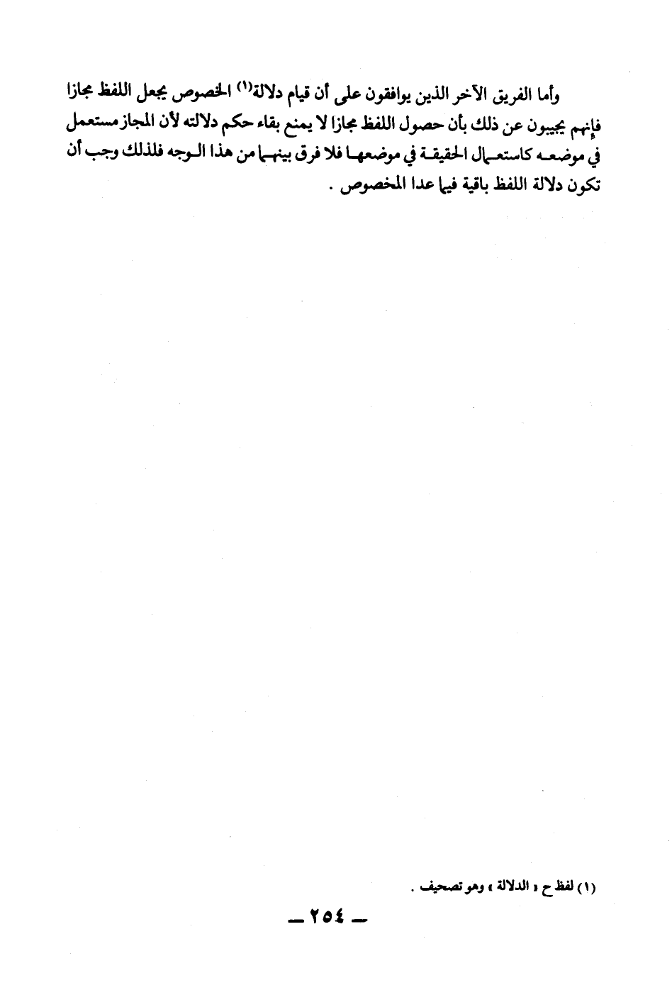 وَأَمَّا الْفَرِيقُ الْآخَرُ الَّذِينَ يُوَافِقُونَ عَلَى أَنَّ قِيَامَ دَلَالَةِ الْخُصُوصِ يَجْعَلُ اللَّفْظَ مَجَازًا فَإِنَّهُمْ يُجِيبُونَ عَنْ ذَلِكَ بِأَنَّ حُصُولَ اللَّفْظِ مَجَازًا لَا يَمْنَعُ بَقَاءَ حُكْمِ دَلَالَتِهِ لِأَنَّ الْمَجَازَ مُسْتَعْمَلٌ فِي مَوْضِعِهِ كَاسْتِعْمَالِ الْحَقِيقَةِ فِي مَوْضِعِهَا فَلَا فَرْقَ بَيْنَهُمَا مِنْ هَذَا الْوَجْهِ فَلِذَلِكَ وَجَبَ أَنْ تَكُونَ دَلَالَةُ اللَّفْظِ بَاقِيَةً فِيمَا عَدَا الْمَخْصُوصَ.