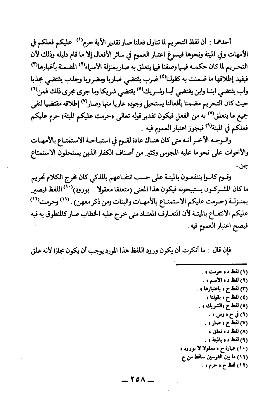 أَحَدُهُمَا: أَنَّ لَفْظَ التَّحْرِيمِ لَمَّا تَنَاوَلَ فِعْلَنَا صَارَ تَقْدِيرُ الْآيَةِ حُرِّمَ عَلَيْكُمْ فِعْلُكُمْ فِي الْأُمَّهَاتِ وَفِي الْمَيْتَةِ وَنَحْوِهَا فَيَسُوغُ اعْتِبَارُ الْعُمُومِ فِي سَائِرِ الْأَفْعَالِ إلَّا مَا قَامَ دَلِيلُهُ وَذَلِكَ لِأَنَّ التَّحْرِيمَ لَمَّا كَانَ حُكْمُهُ فِيمَا وَصَفْنَا فِيمَا يَتَعَلَّقُ بِهِ صَارَ بِمَنْزِلَةِ الْأَسْمَاءِ الْمُضَمَّنَةِ بِأَغْيَارِهَا فَيُفِيدُ إطْلَاقَهَا مَا ضُمِّنَتْ بِهِ كَقَوْلِنَا ضَرَبَ يَقْتَضِي ضَارِبًا وَمَضْرُوبًا وَجَذَبَ يَقْتَضِي مَجْذُوبًا وَأَبٌ يَقْتَضِي ابْنًا وَابْنٌ يَقْتَضِي أَبًا وَشَرِيكٌ يَقْتَضِي شَرِيكًا وَمَا جَرَى مَجْرَى ذَلِكَ فَمِنْ حَيْثُ كَانَ التَّحْرِيمُ مُضَمَّنًا بِأَفْعَالِنَا يَسْتَحِيلُ وُجُودُهُ عَارِيًّا مِنْهَا وَصَارَ إطْلَاقُهُ مُقْتَضِيًا لِنَفْيِ جَمِيعِ مَا يَتَعَلَّقُ بِهِ مِنْ الْفِعْلِ فَيَكُونُ تَقْدِيرُ قَوْله تَعَالَى {حُرِّمَتْ عَلَيْكُمْ الْمَيْتَةُ} [المائدة: 3] حُرِّمَ عَلَيْكُمْ فِعْلُكُمْ فِي الْمَيْتَةِ فَيَجُوزُ اعْتِبَارُ الْعُمُومِ فِيهِ.