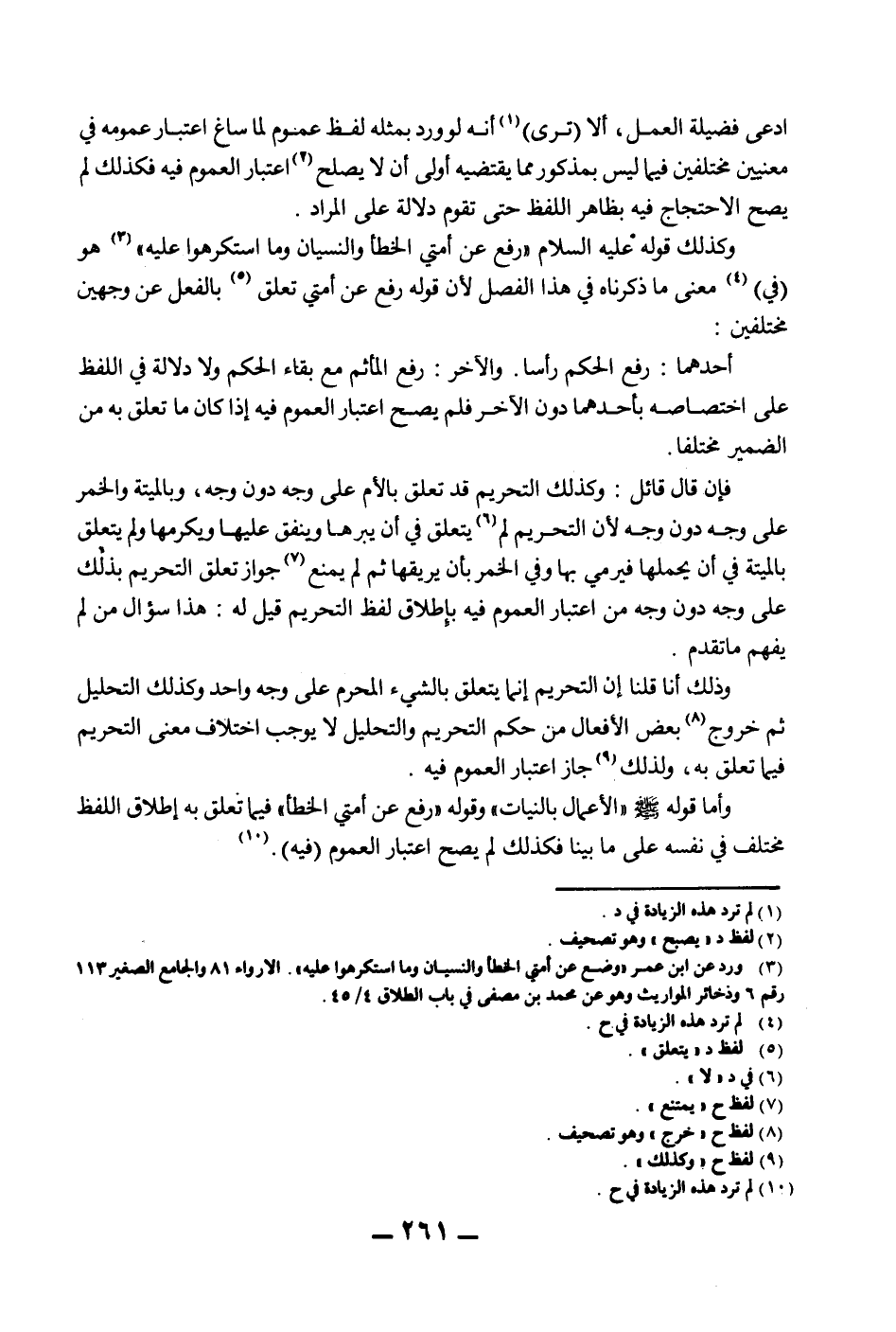 وَكَذَلِكَ قَوْلُهُ - عَلَيْهِ السَّلَامُ - «رُفِعَ عَنْ أُمَّتِي الْخَطَأُ وَالنِّسْيَانُ وَمَا اُسْتُكْرِهُوا عَلَيْهِ» هُوَ (فِي) مَعْنَى مَا ذَكَرْنَاهُ فِي هَذَا الْفَصْلِ؛ لِأَنَّ قَوْلَهُ «رُفِعَ عَنْ أُمَّتِي» تَعَلَّقَ بِالْفِعْلِ عَنْ وَجْهَيْنِ مُخْتَلِفَيْنِ: أَحَدُهُمَا: رَفْعُ الْحُكْمِ رَأْسًا. وَالْآخَرُ: رَفْعُ الْمَأْثَمِ مَعَ بَقَاءِ الْحُكْمِ وَلَا دَلَالَةَ فِي اللَّفْظِ عَلَى اخْتِصَاصِهِ بِأَحَدِهِمَا دُونَ الْآخَرِ فَلَمْ يَصِحَّ اعْتِبَارُ الْعُمُومِ فِيهِ إذَا كَانَ مَا تَعَلَّقَ بِهِ مِنْ الضَّمِيرِ مُخْتَلِفًا. فَإِنْ قَالَ قَائِلٌ: وَكَذَلِكَ التَّحْرِيمُ قَدْ تَعَلَّقَ بِالْأُمِّ عَلَى وَجْهٍ دُونَ وَجْهٍ، وَبِالْمَيْتَةِ وَالْخَمْرِ عَلَى وَجْهٍ دُونَ وَجْهٍ لِأَنَّ التَّحْرِيمَ لَمْ يَتَعَلَّقْ فِي أَنْ يَبَرَّهَا وَيُنْفِقَ عَلَيْهَا وَيُكْرِمَهَا وَلَمْ يَتَعَلَّقْ بِالْمَيْتَةِ فِي أَنْ يَحْمِلَهَا فَيَرْمِيَ بِهَا وَفِي الْخَمْرِ بِأَنْ يُرِيقَهَا ثُمَّ لَمْ يَمْنَعْ جَوَازُ تَعَلُّقِ التَّحْرِيمِ بِذَلِكَ عَلَى وَجْهٍ دُونَ وَجْهٍ مِنْ اعْتِبَارِ الْعُمُومِ فِيهِ بِإِطْلَاقِ لَفْظِ التَّحْرِيمِ.