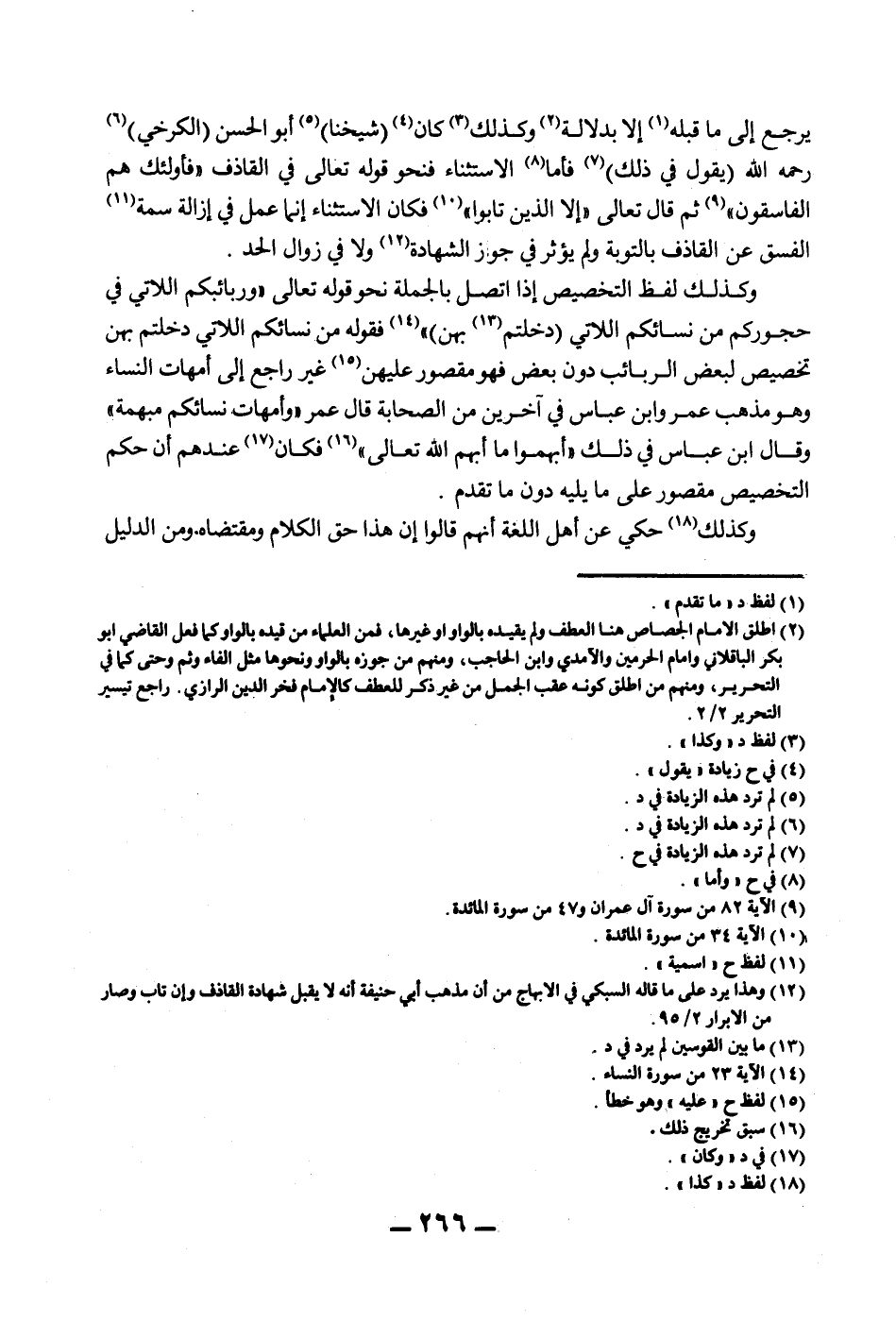 يَرْجِعَ إلَى مَا قَبْلَهُ إلَّا بِدَلَالَةٍ وَكَذَلِكَ كَانَ (شَيْخُنَا) أَبُو الْحَسَنِ (الْكَرْخِيُّ) - رَحِمَهُ اللَّهُ - (يَقُولُ فِي ذَلِكَ) فَأَمَّا الِاسْتِثْنَاءُ فَنَحْوُ قَوْله تَعَالَى فِي الْقَاذِفِ {فَأُولَئِكَ هُمْ الْفَاسِقُونَ} [النور: 55] ثُمَّ قَالَ تَعَالَى {إلَّا الَّذِينَ تَابُوا} [النور: 5] فَكَانَ الِاسْتِثْنَاء إنَّمَا عَمِلَ فِي إزَالَةِ سِمَةِ الْفِسْقِ عَنْ الْقَاذِفِ بِالتَّوْبَةِ وَلَمْ يُؤَثِّرْ فِي جَوَازِ الشَّهَادَةِ وَلَا فِي زَوَالِ الْحَدِّ. وَكَذَلِكَ لَفْظُ التَّخْصِيصِ إذَا اتَّصَلَ بِالْجُمْلَةِ نَحْوُ قَوْله تَعَالَى {وَرَبَائِبُكُمْ اللَّاتِي فِي حُجُورِكُمْ مِنْ نِسَائِكُمْ اللَّاتِي دَخَلْتُمْ بِهِنَّ} [النساء: 23] فَقَوْلُهُ {مِنْ نِسَائِكُمْ اللَّاتِي دَخَلْتُمْ بِهِنَّ} [النساء: 23] تَخْصِيصٌ لِبَعْضِ الرَّبَائِبِ دُونَ بَعْضٍ فَهُوَ مَقْصُورٌ عَلَيْهِنَّ غَيْرُ رَاجِعٍ إلَى أُمَّهَاتِ النِّسَاءِ وَهُوَ مَذْهَبُ عُمَرَ وَابْنِ عَبَّاسٍ فِي آخَرِينَ مِنْ الصَّحَابَةِ قَالَ عُمَرُ " وَأُمَّهَاتُ نِسَائِكُمْ مُبْهَمَةٌ " وَقَالَ ابْنُ عَبَّاسٍ فِي ذَلِكَ " أَبْهِمُوا مَا أَبْهَمَ اللَّهُ تَعَالَى " فَكَانَ عِنْدَهُمْ أَنَّ حُكْمَ التَّخْصِيصِ مَقْصُورٌ عَلَى مَا يَلِيهِ دُونَ مَا تَقَدَّمَ.