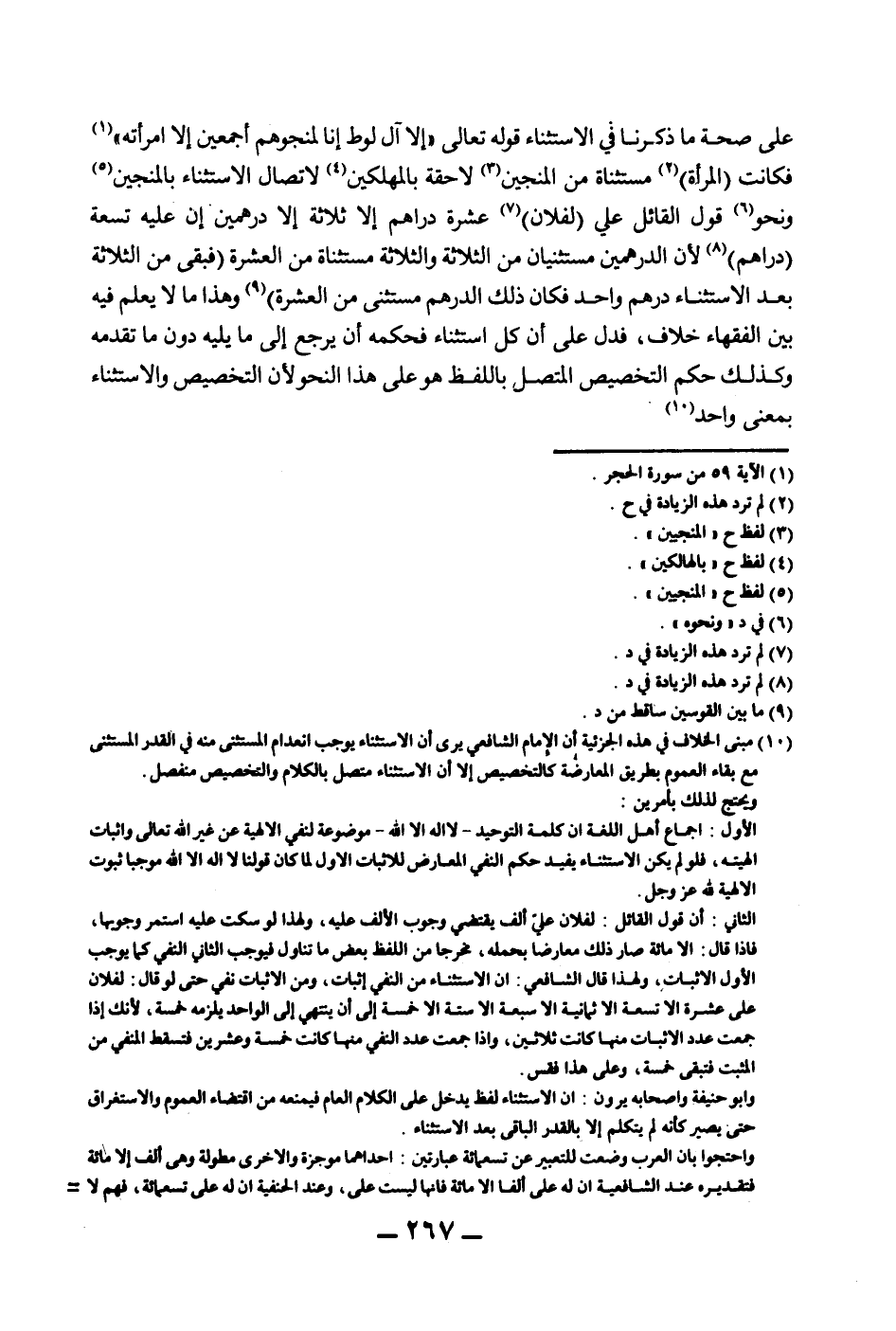 عَلَى صِحَّةِ مَا ذَكَرْنَا فِي الِاسْتِثْنَاءِ قَوْله تَعَالَى {إِلا آلَ لُوطٍ إِنَّا لَمُنَجُّوهُمْ أَجْمَعِينَ} [الحجر: 59] {إِلا امْرَأَتَهُ} [الحجر: 60] فَكَانَتْ (الْمَرْأَةُ) مُسْتَثْنَاةً مِنْ الْمُنَجِّينَ لَاحِقَةً بِالْمُهْلَكِينَ لِاتِّصَالِ الِاسْتِثْنَاءِ بِالْمُنَجِّينَ وَنَحْوُ قَوْلِ الْقَائِلِ عَلَيَّ (لِفُلَانٍ) عَشَرَةُ دَرَاهِمَ إلَّا ثَلَاثَةً إلَّا دِرْهَمَيْنِ أَنَّ عَلَيْهِ تِسْعَةَ (دَرَاهِمَ) لِأَنَّ الدِّرْهَمَيْنِ مُسْتَثْنَيَانِ مِنْ الثَّلَاثَةِ وَالثَّلَاثَةُ مُسْتَثْنَاةٌ مِنْ الْعَشَرَةِ (فَبَقِيَ مِنْ الثَّلَاثَةِ بَعْدَ الِاسْتِثْنَاءِ دِرْهَمٌ وَاحِدٌ فَكَانَ ذَلِكَ الدِّرْهَمُ مُسْتَثْنًى مِنْ الْعَشَرَةِ) وَهَذَا مَا لَا يُعْلَمُ فِيهِ بَيْنَ الْفُقَهَاءِ خِلَافٌ، فَدَلَّ عَلَى أَنَّ كُلَّ اسْتِثْنَاءٍ فَحُكْمُهُ أَنْ يَرْجِعَ إلَى مَا يَلِيهِ دُونَ مَا تَقَدَّمَهُ وَكَذَلِكَ حُكْمُ التَّخْصِيصِ الْمُتَّصِلِ بِاللَّفْظِ هُوَ عَلَى هَذَا النَّحْوِ لِأَنَّ التَّخْصِيصَ وَالِاسْتِثْنَاءَ بِمَعْنًى وَاحِدٍ