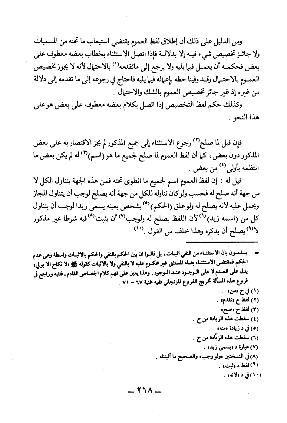 وَمِنْ الدَّلِيلِ عَلَى ذَلِكَ أَنَّ إطْلَاقَ لَفْظِ الْعُمُومِ يَقْتَضِي اسْتِيعَابَ مَا تَحْتَهُ مِنْ الْمُسَمَّيَاتِ وَلَا جَائِزٌ تَخْصِيصُ شَيْءٍ فِيهِ إلَّا بِدَلَالَةٍ فَإِذَا اتَّصَلَ الِاسْتِثْنَاءُ بِخِطَابٍ بَعْضُهُ مَعْطُوفٌ عَلَى بَعْضٍ فَحُكْمُهُ أَنْ يَعْمَلَ فِيمَا يَلِيهِ وَلَا يَرْجِعَ إلَى مَا تَقَدَّمَهُ بِالِاحْتِمَالِ لِأَنَّهُ لَا يَجُوزُ تَخْصِيصُ الْعُمُومِ بِالِاحْتِمَالِ وَقَدْ وَفَّيْنَا حَظَّهُ بِإِعْمَالِهِ فِيمَا يَلِيهِ فَاحْتَاجَ فِي رُجُوعِهِ إلَى مَا تَقَدَّمَهُ إلَى دَلَالَةٍ مِنْ غَيْرِهِ إذْ غَيْرُ جَائِزٍ تَخْصِيصُ الْعُمُومِ بِالشَّكِّ وَالِاحْتِمَالِ.