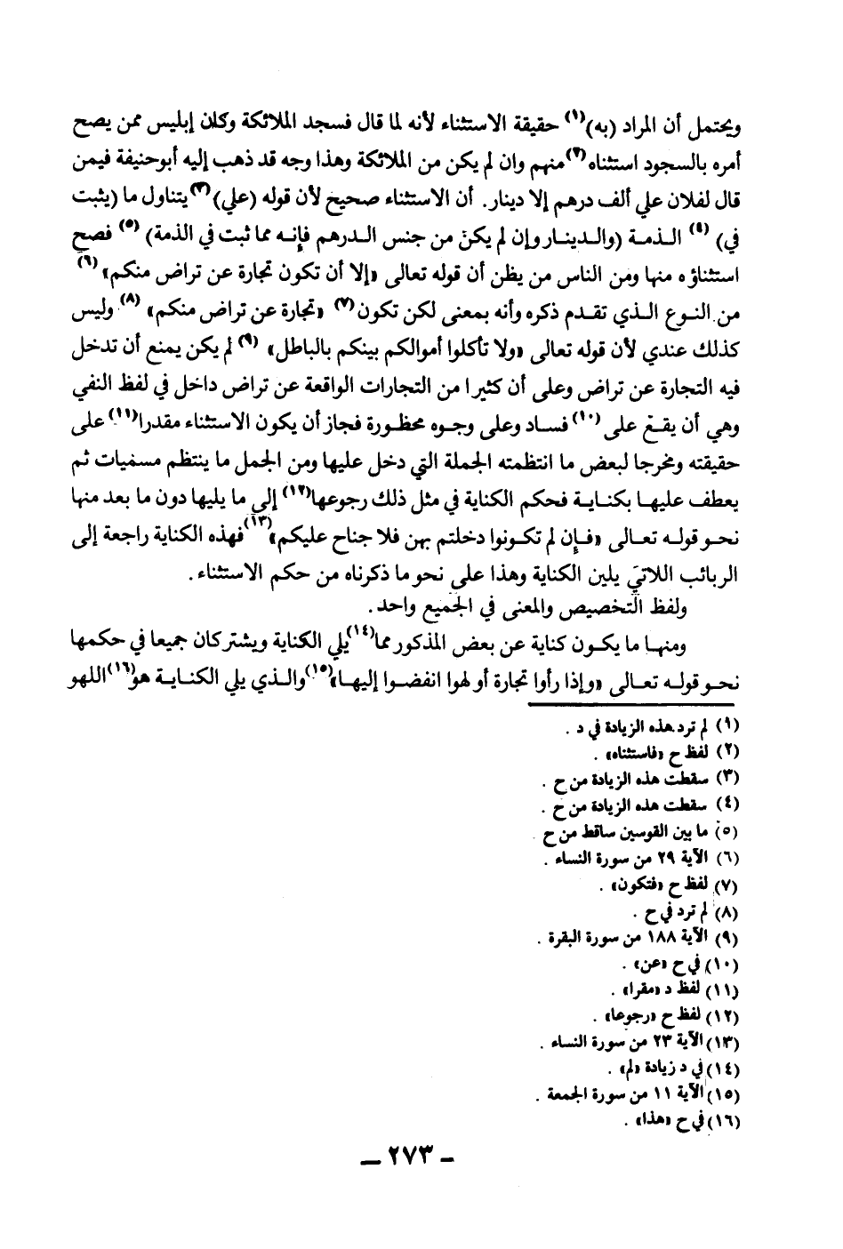 وَيَحْتَمِلُ أَنَّ الْمُرَادَ (بِهِ) حَقِيقَةُ الِاسْتِثْنَاءِ لِأَنَّهُ لَمَّا قَالَ فَسَجَدَ الْمَلَائِكَةُ وَكَانَ إبْلِيسُ مِمَّنْ يَصِحُّ أَمْرُهُ بِالسُّجُودِ اسْتَثْنَاهُ مِنْهُمْ وَإِنْ لَمْ يَكُنْ مِنْ الْمَلَائِكَةِ وَهَذَا وَجْهٌ قَدْ ذَهَبَ إلَيْهِ أَبُو حَنِيفَةَ فِيمَنْ قَالَ لِفُلَانٍ عَلَيَّ أَلْفُ دِرْهَمٍ إلَّا دِينَارٌ. أَنَّ الِاسْتِثْنَاءَ صَحِيحٌ لِأَنَّ قَوْلَهُ (عَلَيَّ) يَتَنَاوَلُ مَا (يَثْبُتُ فِي) الذِّمَّةِ (وَالدِّينَارُ وَإِنْ لَمْ يَكُنْ مِنْ جِنْسِ الدِّرْهَمِ فَإِنَّهُ مِمَّا ثَبَتَ فِي الذِّمَّةِ) فَصَحَّ اسْتِثْنَاؤُهُ مِنْهَا وَمِنْ النَّاسِ مَنْ يَظُنُّ أَنَّ قَوْله تَعَالَى {إلَّا أَنْ تَكُونَ تِجَارَةً عَنْ تَرَاضٍ مِنْكُمْ} [النساء: 29] مِنْ النَّوْعِ الَّذِي تَقَدَّمَ ذِكْرُهُ وَأَنَّهُ بِمَعْنَى لَكِنْ تَكُونُ {تِجَارَةً عَنْ تَرَاضٍ مِنْكُمْ} [النساء: 29] وَلَيْسَ كَذَلِكَ عِنْدِي لِأَنَّ قَوْله تَعَالَى {وَلَا تَأْكُلُوا أَمْوَالَكُمْ بَيْنَكُمْ بِالْبَاطِلِ} [البقرة: 188] لَمْ يَكُنْ يَمْنَعُ أَنْ تَدْخُلَ فِيهِ التِّجَارَةُ عَنْ تَرَاضٍ وَعَلَى أَنَّ كَثِيرًا مِنْ التِّجَارَاتِ الْوَاقِعَةِ عَنْ تَرَاضٍ دَاخِلٌ فِي لَفْظِ النَّفْيِ وَهِيَ أَنْ يَقَعَ عَلَى فَسَادٍ وَعَلَى وُجُوهٍ مَحْظُورَةٍ فَجَازَ أَنْ يَكُونَ الِاسْتِثْنَاءُ مُقَدَّرًا عَلَى حَقِيقَتِهِ وَمُخْرِجًا لِبَعْضِ مَا انْتَظَمَتْهُ الْجُمْلَةُ الَّتِي دَخَلَ عَلَيْهَا وَمِنْ الْجُمَلِ مَا يَنْتَظِمُ مُسَمَّيَاتٍ ثُمَّ يُعْطَفُ عَلَيْهَا بِكِنَايَةٍ فَحُكْمُ الْكِنَايَةِ فِي مِثْل ذَلِكَ رُجُوعُهَا إلَى مَا يَلِيهَا دُونَ مَا بَعُدَ مِنْهَا نَحْوُ قَوْله تَعَالَى {فَإِنْ لَمْ تَكُونُوا دَخَلْتُمْ بِهِنَّ فَلَا جُنَاحَ عَلَيْكُمْ} [النساء: 23] فَهَذِهِ الْكِنَايَةُ رَاجِعَةٌ إلَى الرَّبَائِبِ اللَّاتِي يَلِينَ الْكِنَايَةَ، وَهَذَا عَلَى نَحْوِ مَا ذَكَرْنَاهُ مِنْ حُكْمِ الِاسْتِثْنَاءِ وَلَفْظِ التَّخْصِيصِ وَالْمَعْنَى فِي الْجَمِيعِ وَاحِدٌ.