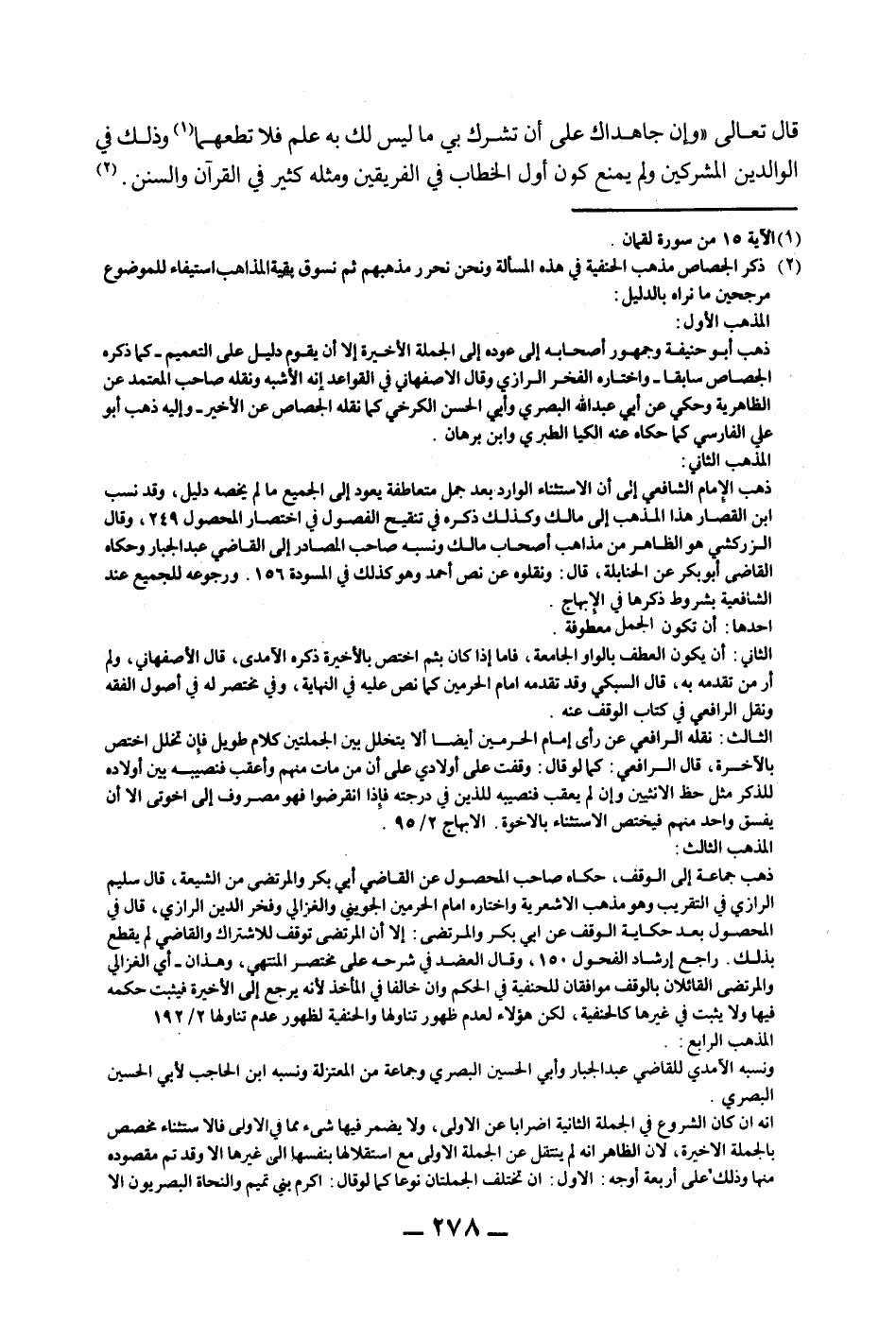 قَالَ تَعَالَى {وَإِنْ جَاهَدَاك عَلَى أَنْ تُشْرِكَ بِي مَا لَيْسَ لَك بِهِ عِلْمٌ فَلَا تُطِعْهُمَا} [لقمان: 15] وَذَلِكَ فِي الْوَالِدَيْنِ الْمُشْرِكَيْنِ وَلَمْ يَمْنَعْ كَوْنُ أَوَّلِ الْخِطَابِ فِي الْفَرِيقَيْنِ، وَمِثْلُهُ كَثِيرٌ فِي الْقُرْآنِ وَالسُّنَنِ.