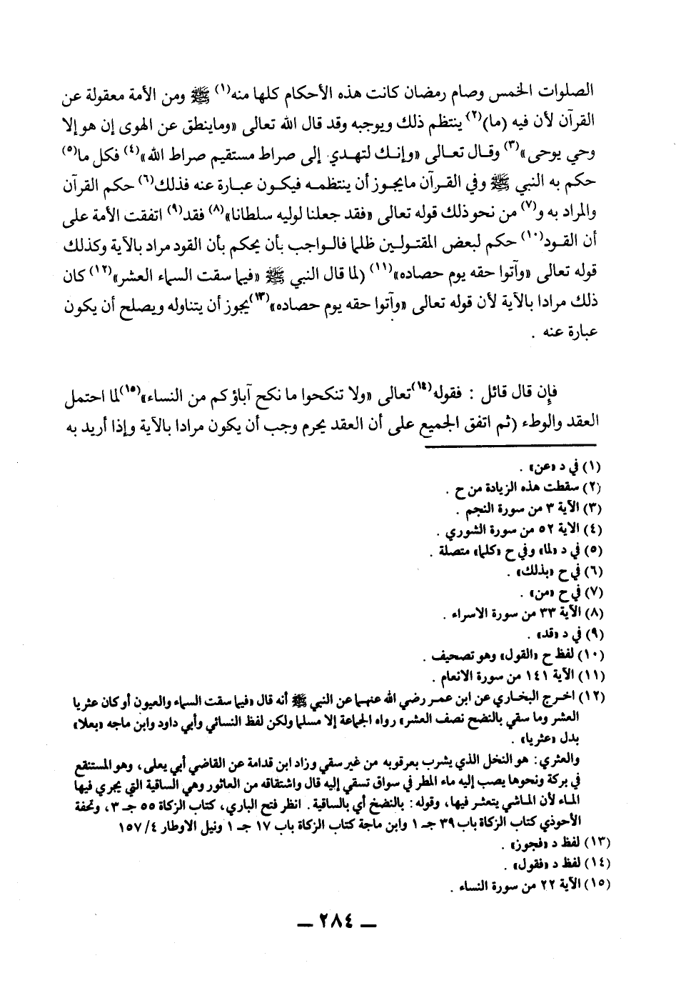 الصَّلَوَاتِ الْخَمْسَ وَصَامَ رَمَضَانَ كَانَتْ هَذِهِ الْأَحْكَامُ كُلُّهَا مِنْهُ - صَلَّى اللَّهُ عَلَيْهِ وَسَلَّمَ - وَمِنْ الْأُمَّةِ مَعْقُولَةً عَنْ الْقُرْآنِ لِأَنَّ فِيهِ (مَا) يَنْتَظِمُ ذَلِكَ وَيُوجِبُهُ وَقَدْ قَالَ اللَّهُ تَعَالَى {وَمَا يَنْطِقُ عَنِ الْهَوَى} [النجم: 3] {إِنْ هُوَ إِلا وَحْيٌ يُوحَى} [النجم: 4] وَقَالَ تَعَالَى {وَإِنَّكَ لَتَهْدِي إِلَى صِرَاطٍ مُسْتَقِيمٍ} [الشورى: 52] {صِرَاطِ اللَّهِ} [الشورى: 53] فَكُلُّ مَا حَكَمَ بِهِ النَّبِيُّ - صَلَّى اللَّهُ عَلَيْهِ وَسَلَّمَ - وَفِي الْقُرْآنِ مَا يَجُوزُ أَنْ يَنْتَظِمَهُ فَيَكُونُ عِبَارَةً عَنْهُ فَذَلِكَ حُكْمُ الْقُرْآنِ وَالْمُرَادُ بِهِ وَمِنْ نَحْوِ ذَلِكَ قَوْله تَعَالَى {فَقَدْ جَعَلْنَا لِوَلِيِّهِ سُلْطَانًا} [الإسراء: 33] فَقَدْ اتَّفَقَتْ الْأُمَّةُ عَلَى أَنَّ الْقَوَدَ حُكْمٌ لِبَعْضِ الْمَقْتُولِينَ ظُلْمًا فَالْوَاجِبُ بِأَنْ يَحْكُمَ بِأَنَّ الْقَوَدَ مُرَادٌ بِالْآيَةِ وَكَذَلِكَ قَوْله تَعَالَى {وَآتُوا حَقَّهُ يَوْمَ حَصَادِهِ} [الأنعام: 141] (لَمَّا قَالَ النَّبِيُّ - صَلَّى اللَّهُ عَلَيْهِ وَسَلَّمَ - «فِيمَا سَقَتْ السَّمَاءُ الْعُشْرُ» ) كَانَ ذَلِكَ مُرَادًا بِالْآيَةِ لِأَنَّ قَوْله تَعَالَى {وَآتُوا حَقَّهُ يَوْمَ حَصَادِهِ} [الأنعام: 141] يَجُوزُ أَنْ يَتَنَاوَلَهُ وَيَصْلُحُ أَنْ يَكُونَ عِبَارَةً عَنْهُ. فَإِنْ قَالَ قَائِلٌ: فَقَوْلُهُ تَعَالَى {وَلَا تَنْكِحُوا مَا نَكَحَ آبَاؤُكُمْ مِنْ النِّسَاءِ} [النساء: 22] لَمَّا احْتَمَلَ الْعَقْدَ وَالْوَطْءَ (ثُمَّ اتَّفَقَ الْجَمِيعُ عَلَى أَنَّ الْعَقْدَ يَحْرُمُ وَجَبَ أَنْ يَكُونَ مُرَادًا بِالْآيَةِ، وَإِذَا أُرِيدَ بِهِ