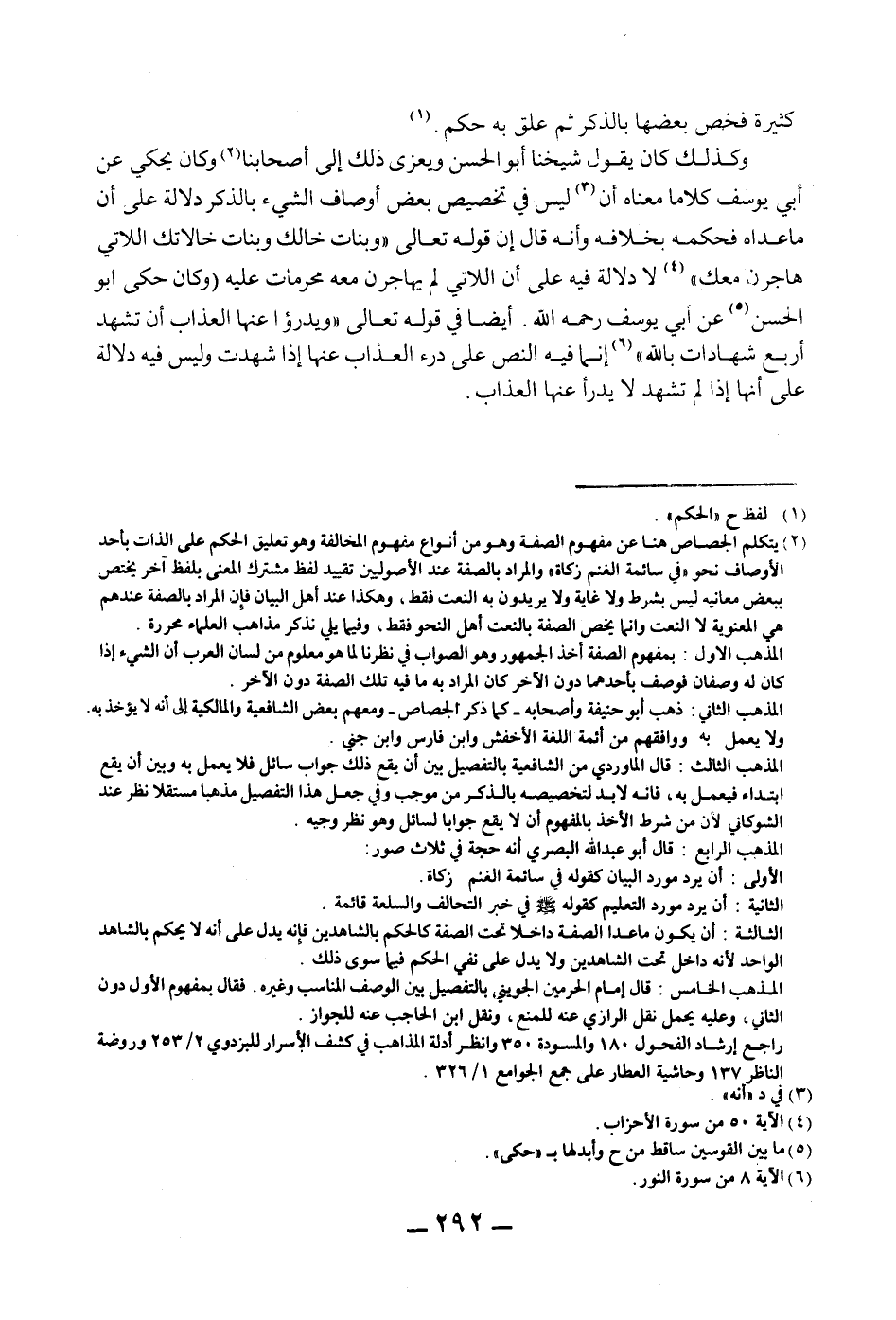 كَثِيرَةٍ فَخُصَّ بَعْضُهَا بِالذِّكْرِ ثُمَّ عُلِّقَ بِهِ حُكْمٌ. وَكَذَلِكَ كَانَ يَقُولُ شَيْخُنَا أَبُو الْحَسَنِ وَيُعْزِي ذَلِكَ إلَى أَصْحَابِنَا وَكَانَ يَحْكِي عَنْ أَبِي يُوسُفَ كَلَامًا مَعْنَاهُ أَنْ لَيْسَ فِي تَخْصِيصِ بَعْضِ أَوْصَافِ الشَّيْءِ بِالذِّكْرِ دَلَالَةٌ عَلَى أَنَّ مَا عَدَاهُ فَحُكْمُهُ بِخِلَافِهِ وَأَنَّهُ قَالَ إنَّ قَوْله تَعَالَى: {وَبَنَاتِ خَالِكَ وَبَنَاتِ خَالَاتِكَ اللَّاتِي هَاجَرْنَ مَعَك} [الأحزاب: 50] لَا دَلَالَةَ فِيهِ عَلَى أَنَّ اللَّاتِي لَمْ يُهَاجِرْنَ مَعَهُ مُحَرَّمَاتٌ عَلَيْهِ (وَكَانَ حَكَى أَبُو الْحَسَنِ عَنْ أَبِي يُوسُفَ - رَحِمَهُ اللَّهُ -. أَيْضًا) فِي قَوْله تَعَالَى {وَيَدْرَأُ عَنْهَا الْعَذَابَ أَنْ تَشْهَدَ أَرْبَعَ شَهَادَاتٍ بِاَللَّهِ} [النور: 8] إنَّمَا فِيهِ النَّصُّ عَلَى دَرْءِ الْعَذَابِ عَنْهَا إذَا شَهِدَتْ وَلَيْسَ فِيهِ دَلَالَةٌ عَلَى أَنَّهَا إذَا لَمْ تَشْهَدْ لَا يُدْرَأُ عَنْهَا الْعَذَابُ.
