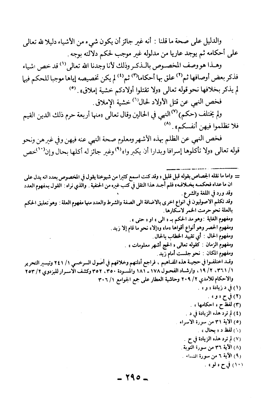وَهَذَا هُوَ وَصْفُ الْمَخْصُوصِ بِالذِّكْرِ وَذَلِكَ لِأَنَّا وَجَدْنَا اللَّهَ تَعَالَى قَدْ خَصَّ أَشْيَاءَ فَذَكَرَ بَعْضَ أَوْصَافِهَا ثُمَّ عَلَّقَ بِهَا أَحْكَامًا ثُمَّ لَمْ يَكُنْ تَخْصِيصُهُ إيَّاهَا مُوجِبًا لِلْحُكْمِ فِيمَا لَمْ يُذْكَرْ بِخِلَافِهَا نَحْوُ قَوْله تَعَالَى {وَلَا تَقْتُلُوا أَوْلَادَكُمْ خَشْيَةَ إمْلَاقٍ} [الإسراء: 31] . فَخَصَّ النَّهْيَ عَنْ قَتْلِ الْأَوْلَادِ لِحَالِ خَشْيَةِ الْإِمْلَاقِ. وَلَمْ يَخْتَلِفْ (حُكْمُ) النَّهْيِ فِي الْحَالَيْنِ وَقَالَ تَعَالَى {مِنْهَا أَرْبَعَةٌ حُرُمٌ ذَلِكَ الدِّينُ الْقَيِّمُ فَلَا تَظْلِمُوا فِيهِنَّ أَنْفُسَكُمْ} [التوبة: 36] . فَخَصَّ النَّهْيَ عَنْ الظُّلْمِ بِهَذِهِ الْأَشْهُرِ وَمَعْلُومٌ صِحَّةُ النَّهْيِ عَنْهُ فِيهِنَّ وَفِي غَيْرِهِنَّ وَنَحْوُ قَوْله تَعَالَى {وَلَا تَأْكُلُوهَا إسْرَافًا وَبِدَارًا أَنْ يَكْبَرُوا} [النساء: 6] وَغَيْرُ جَائِزٍ لَهُ أَكْلُهَا بِحَالٍ وَإِنْ خَصَّ
