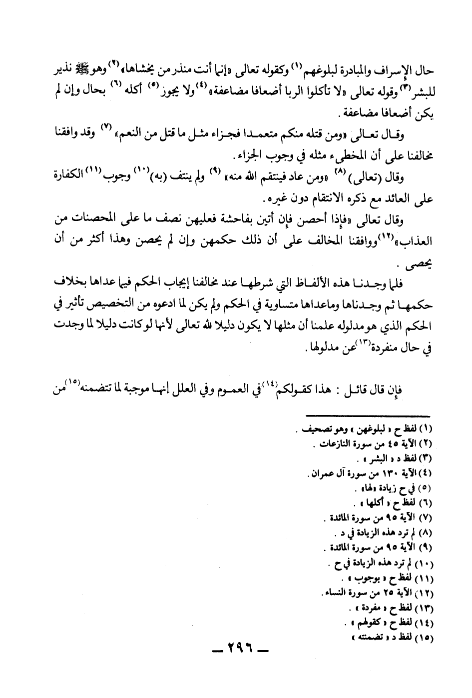 وَقَالَ تَعَالَى {وَمَنْ قَتَلَهُ مِنْكُمْ مُتَعَمِّدًا فَجَزَاءٌ مِثْلُ مَا قَتَلَ مِنْ النَّعَمِ} [المائدة: 95] وَقَدْ وَافَقَنَا مُخَالِفُنَا عَلَى أَنَّ الْمُخْطِئَ مِثْلُهُ فِي وُجُوبِ الْجَزَاءِ. وَقَالَ (تَعَالَى) {وَمَنْ عَادَ فَيَنْتَقِمُ اللَّهُ مِنْهُ} [المائدة: 95] وَلَمْ يَنْتِفْ (بِهِ) وُجُوبُ الْكَفَّارَةِ عَلَى الْعَائِدِ مَعَ ذِكْرِهِ الِانْتِقَامَ دُونَ غَيْرِهِ. وَقَالَ تَعَالَى {فَإِذَا أُحْصِنَّ فَإِنْ أَتَيْنَ بِفَاحِشَةٍ فَعَلَيْهِنَّ نِصْفُ مَا عَلَى الْمُحْصَنَاتِ مِنْ الْعَذَابِ} [النساء: 25] وَوَافَقَنَا الْمُخَالِفُ عَلَى أَنَّ ذَلِكَ حُكْمُهُنَّ وَإِنْ لَمْ يُحْصَنَ وَهَذَا أَكْثَرُ مِنْ أَنْ يُحْصَى. فَلَمَّا وَجَدْنَا هَذِهِ الْأَلْفَاظَ الَّتِي شَرْطُهَا عِنْدَ مُخَالِفِنَا إيجَابُ الْحُكْمِ فِيمَا عَدَاهَا بِخِلَافِ حُكْمِهَا ثُمَّ وَجَدْنَاهَا وَمَا عَدَاهَا مُتَسَاوِيَةً فِي الْحُكْمِ وَلَمْ يَكُنْ لِمَا ادَّعَوْهُ مِنْ التَّخْصِيصِ تَأْثِيرٌ فِي الْحُكْمِ الَّذِي هُوَ مَدْلُولُهُ عَلِمْنَا أَنَّ مِثْلَهَا لَا يَكُونُ دَلِيلًا لِلَّهِ تَعَالَى لِأَنَّهَا لَوْ كَانَتْ دَلِيلًا لَمَا وُجِدَتْ فِي حَالٍ مُنْفَرِدَةٍ عَنْ مَدْلُولِهَا.