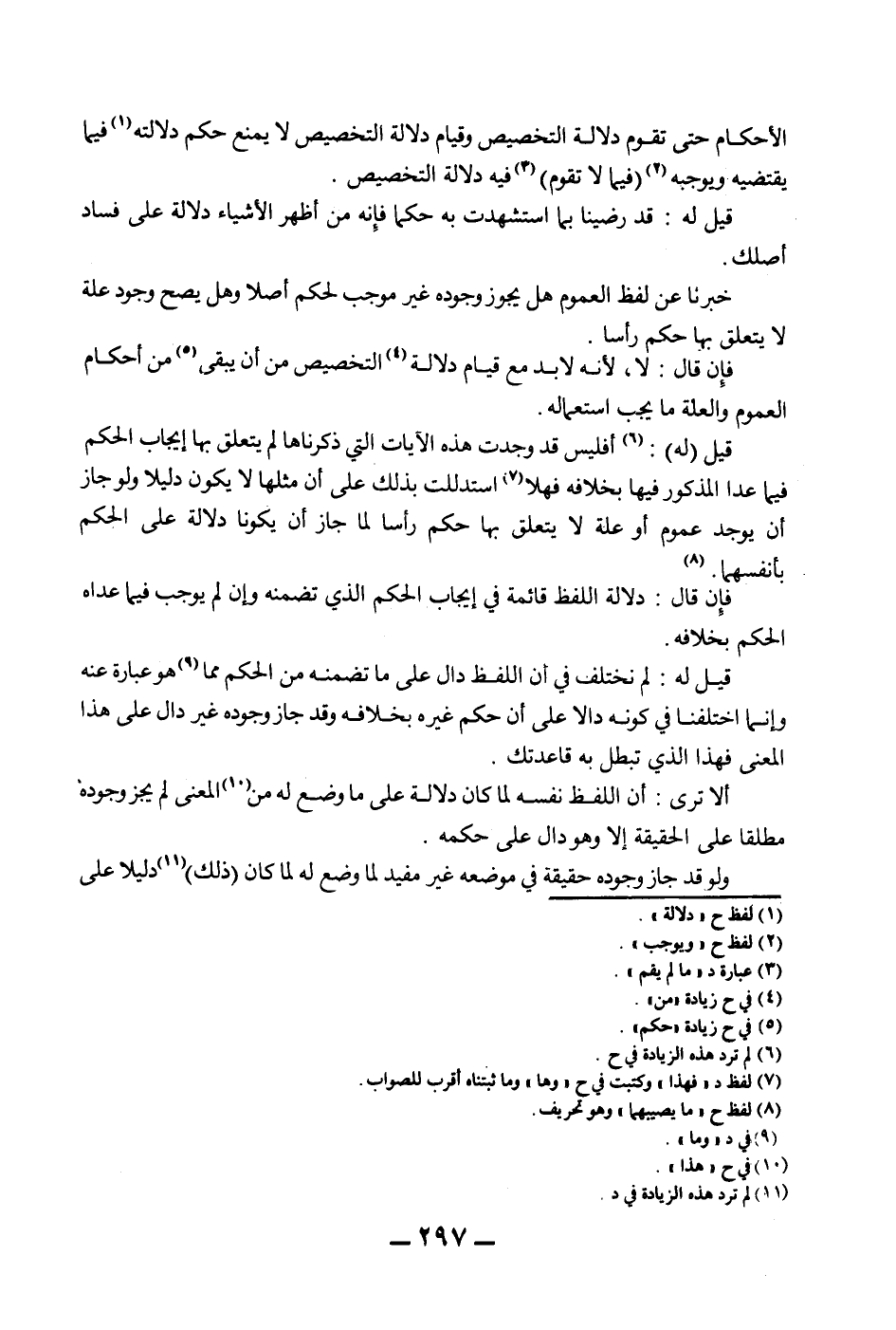 الْأَحْكَامِ حَتَّى تَقُومَ دَلَالَةُ التَّخْصِيصِ وَقِيَامُ دَلَالَةِ التَّخْصِيصِ لَا يَمْنَعُ حُكْمَ دَلَالَتِهِ فِيمَا يَقْتَضِيهِ وَيُوجِبُهُ (فِيمَا لَا تَقُومُ) فِيهِ دَلَالَةُ التَّخْصِيصِ. قِيلَ لَهُ: قَدْ رَضِينَا بِمَا اسْتَشْهَدْت بِهِ حُكْمًا فَإِنَّهُ مِنْ أَظْهَرِ الْأَشْيَاءِ دَلَالَةً عَلَى فَسَادِ أَصْلِك. خَبِّرْنَا عَنْ لَفْظِ الْعُمُومِ هَلْ يَجُوزُ وُجُودُهُ غَيْرَ مُوجِبٍ لِحُكْمٍ أَصْلًا وَهَلْ يَصِحُّ وُجُودُ عِلَّةٍ لَا يَتَعَلَّقُ بِهَا حُكْمٌ رَأْسًا. فَإِنْ قَالَ: لَا، لِأَنَّهُ لَا بُدَّ مَعَ قِيَامِ دَلَالَةِ التَّخْصِيصِ مِنْ أَنْ يَبْقَى مِنْ أَحْكَامِ الْعُمُومِ وَالْعِلَّةِ مَا يَجِبُ اسْتِعْمَالُهُ. قِيلَ (لَهُ) : أَفَلَيْسَ قَدْ وَجَدْت هَذِهِ الْآيَاتِ الَّتِي ذَكَرْنَاهَا لَمْ يَتَعَلَّقْ بِهَا إيجَابُ الْحُكْمِ فِيمَا عَدَا الْمَذْكُورَ فِيهَا بِخِلَافِهِ فَهَلَّا اسْتَدْلَلْت بِذَلِكَ عَلَى أَنَّ مِثْلَهَا لَا يَكُونُ دَلِيلًا وَلَوْ جَازَ أَنْ يُوجَدَ عُمُومٌ أَوْ عِلَّةٌ لَا يَتَعَلَّقُ بِهَا حُكْمٌ رَأْسًا لَمَا جَازَ أَنْ يَكُونَا دَلَالَةً عَلَى الْحُكْمِ بِأَنْفُسِهِمَا.