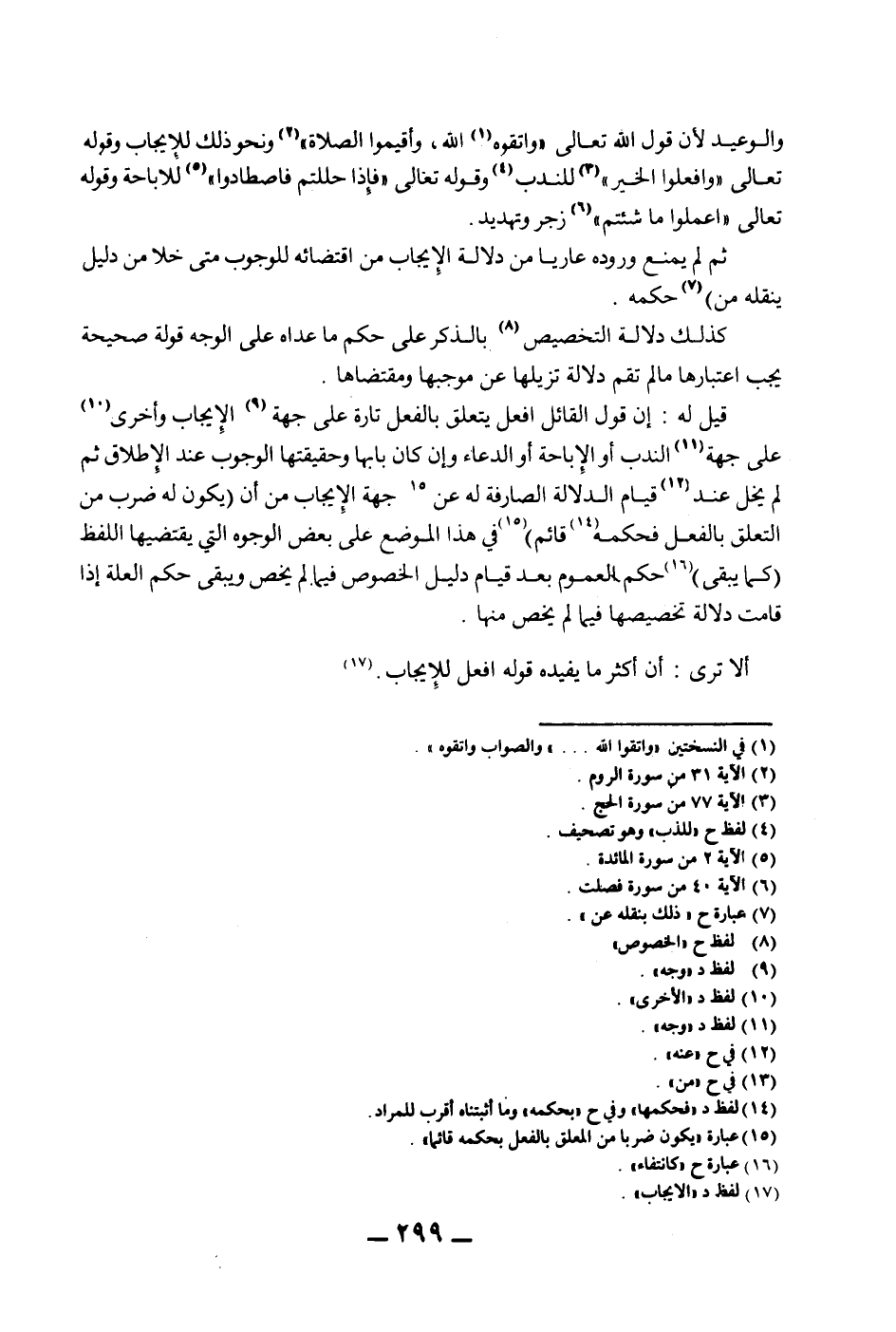 وَالْوَعِيدِ لِأَنَّ قَوْلَ اللَّهِ تَعَالَى {وَاتَّقُوا اللَّهَ} [البقرة: 189] ، {وَأَقِيمُوا الصَّلَاةَ} [البقرة: 43] وَنَحْوَ ذَلِكَ لِلْإِيجَابِ وقَوْله تَعَالَى {وَافْعَلُوا الْخَيْرَ} [الحج: 77] لِلنَّدْبِ وقَوْله تَعَالَى {وَإِذَا حَلَلْتُمْ فَاصْطَادُوا} [المائدة: 2] لِلْإِبَاحَةِ وقَوْله تَعَالَى {اعْمَلُوا مَا شِئْتُمْ} [فصلت: 40] زَجْرٌ وَتَهْدِيدٌ. ثُمَّ لَمْ يَمْنَعْ وُرُودُهُ عَارِيًّا مِنْ دَلَالَةِ الْإِيجَابِ مِنْ (اقْتِضَائِهِ لِلْوُجُوبِ مَتَى خَلَا مِنْ دَلِيلٍ يَنْقُلُهُ مِنْ) حُكْمِهِ. كَذَلِكَ دَلَالَةُ التَّخْصِيصِ بِالذِّكْرِ عَلَى حُكْمِ مَا عَدَاهُ عَلَى الْوَجْهِ قَوْلَةٌ صَحِيحَةٌ يَجِبُ اعْتِبَارُهَا مَا لَمْ تَقُمْ دَلَالَةٌ تُزِيلُهَا عَنْ مُوجَبِهَا وَمُقْتَضَاهَا. قِيلَ لَهُ: إنَّ قَوْلَ الْقَائِلِ افْعَلْ يَتَعَلَّقُ بِالْفِعْلِ تَارَةً عَلَى جِهَةِ الْإِيجَابِ وَأُخْرَى عَلَى جِهَةِ النَّدْبِ أَوْ الْإِبَاحَةِ أَوْ الدُّعَاءِ وَإِنْ كَانَ بَابُهَا وَحَقِيقَتُهَا الْوُجُوبَ عِنْدَ الْإِطْلَاقِ ثُمَّ لَمْ يَخْلُ عِنْدَ قِيَامِ الدَّلَالَةِ الصَّارِفَةِ لَهُ عَنْ جِهَةِ الْإِيجَابِ مِنْ أَنْ (يَكُونَ لَهُ ضَرْبٌ مِنْ التَّعَلُّقِ بِالْفِعْلِ فَحُكْمُهُ قَائِمٌ) فِي هَذَا الْمَوْضِعِ عَلَى بَعْضِ الْوُجُوهِ الَّتِي يَقْتَضِيهَا اللَّفْظُ (كَمَا يَبْقَى) حُكْمُ الْعُمُومِ بَعْدَ قِيَامِ دَلِيلِ الْخُصُوصِ فِيمَا لَمْ يُخَصَّ وَيَبْقَى حُكْمُ الْعِلَّةِ إذَا قَامَتْ دَلَالَةُ تَخْصِيصِهَا فِيمَا لَمْ يُخَصَّ مِنْهَا.