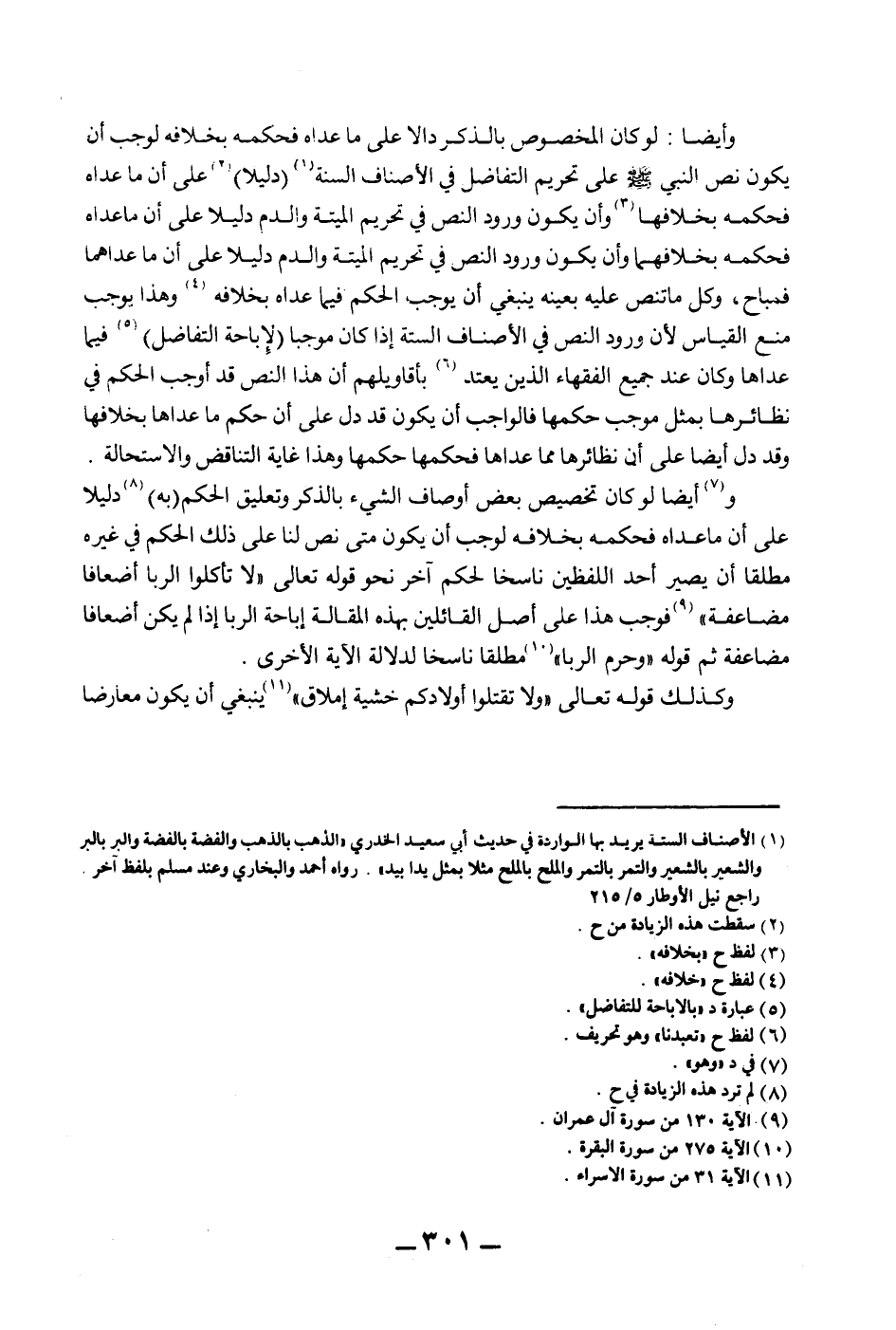وَأَيْضًا: لَوْ كَانَ الْمَخْصُوصُ بِالذِّكْرِ دَالًّا عَلَى مَا عَدَاهُ فَحُكْمُهُ بِخِلَافِهِ لَوَجَبَ أَنْ يَكُونَ نَصُّ النَّبِيِّ - صَلَّى اللَّهُ عَلَيْهِ وَسَلَّمَ - تَحْرِيمَ التَّفَاضُلِ فِي الْأَصْنَافِ السِّتَّةِ (دَلِيلًا) عَلَى أَنَّ مَا عَدَاهُ فَحُكْمُهُ بِخِلَافِهَا وَأَنْ يَكُونَ وُرُودُ النَّصِّ فِي تَحْرِيمِ الْمَيْتَةِ وَالدَّمِ دَلِيلًا عَلَى أَنَّ مَا عَدَاهُ فَحُكْمُهُ بِخِلَافِهِمَا وَأَنْ يَكُونَ وُرُودُ النَّصِّ فِي تَحْرِيمِ الْمَيْتَةِ وَالدَّمِ دَلِيلًا عَلَى أَنَّ مَا عَدَاهُمَا فَمُبَاحٌ، وَكُلُّ مَا تَنُصُّ عَلَيْهِ بِعَيْنِهِ يَنْبَغِي أَنْ يُوجِبَ الْحُكْمَ فِيمَا عَدَاهُ بِخِلَافِهِ وَهَذَا يُوجِبُ مَنْعَ الْقِيَاسِ لِأَنَّ وُرُودَ النَّصِّ فِي الْأَصْنَافِ السِّتَّةِ إذَا كَانَ مُوجِبًا (لِإِبَاحَةِ التَّفَاضُلِ) فِيمَا عَدَاهَا وَكَانَ عِنْدَ جَمِيعِ الْفُقَهَاءِ الَّذِينَ يُعْتَدُّ بِأَقَاوِيلِهِمْ أَنَّ هَذَا النَّصَّ قَدْ أَوْجَبَ الْحُكْمَ فِي نَظَائِرِهَا بِمِثْلِ مُوجَبِ حُكْمِهَا فَالْوَاجِبُ أَنْ يَكُونَ قَدْ دَلَّ عَلَى أَنَّ حُكْمَ مَا عَدَاهَا بِخِلَافِهَا وَقَدْ دَلَّ أَيْضًا عَلَى أَنَّ نَظَائِرَهَا مِمَّا عَدَاهَا فَحُكْمُهَا حُكْمُهَا وَهَذَا غَايَةُ التَّنَاقُضِ وَالِاسْتِحَالَةِ.