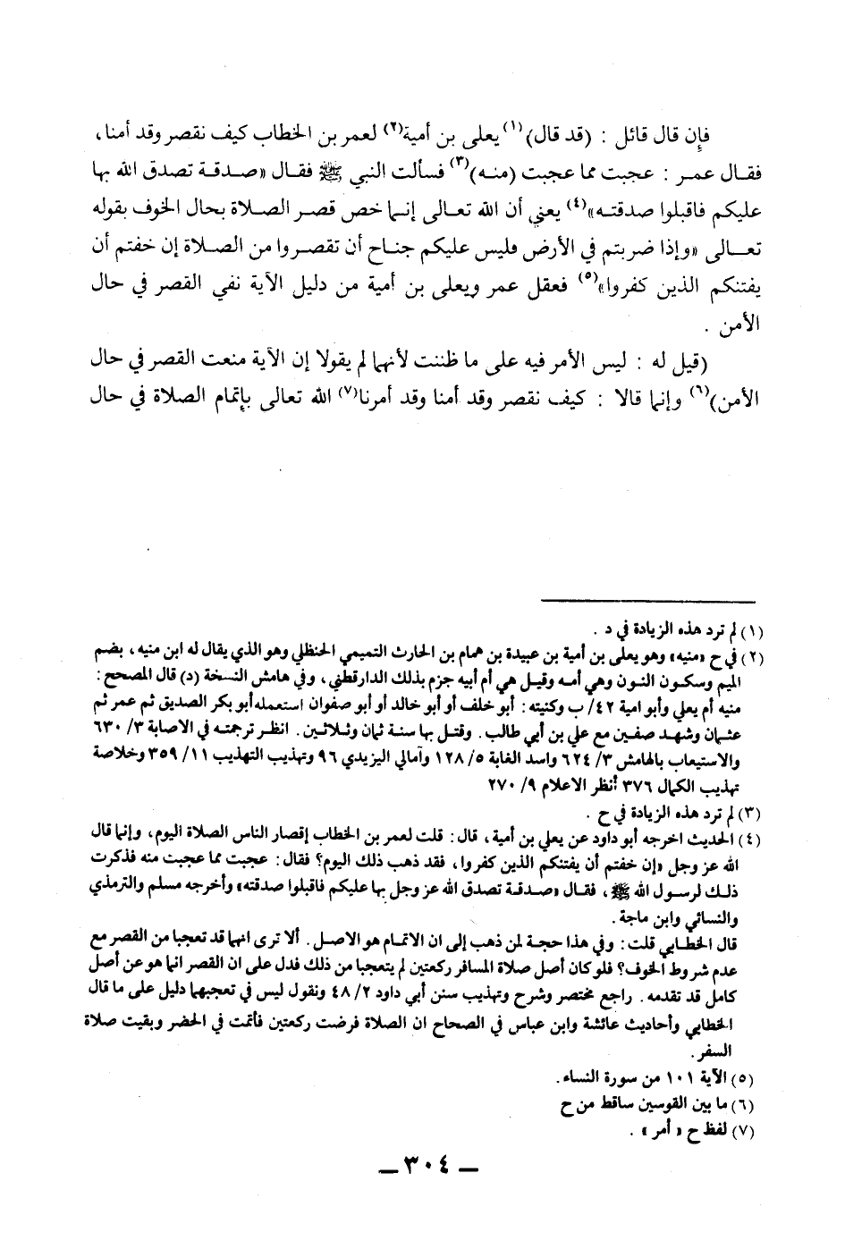 فَإِنْ قَالَ قَائِلٌ: (قَدْ «قَالَ يَعْلَى بْنُ أُمَيَّةَ لِعُمَرَ بْنِ الْخَطَّابِ كَيْفَ نَقْصُرُ وَقَدْ أَمِنَّا، فَقَالَ عُمَرُ: عَجِبْتُ مِمَّا عَجِبْتَ مِنْهُ فَسَأَلْتُ النَّبِيَّ - صَلَّى اللَّهُ عَلَيْهِ وَسَلَّمَ - فَقَالَ صَدَقَةٌ تَصَدَّقَ اللَّهُ بِهَا عَلَيْكُمْ فَاقْبَلُوا صَدَقَتَهُ» يَعْنِي أَنَّ اللَّهَ تَعَالَى إنَّمَا خَصَّ قَصْرَ الصَّلَاةِ بِحَالِ الْخَوْفِ بِقَوْلِهِ تَعَالَى {وَإِذَا ضَرَبْتُمْ فِي الْأَرْضِ فَلَيْسَ عَلَيْكُمْ جُنَاحٌ أَنْ تَقْصُرُوا مِنْ الصَّلَاةِ إنْ خِفْتُمْ أَنْ يَفْتِنَكُمْ الَّذِينَ كَفَرُوا} [النساء: 101] فَعَقَلَ عُمَرُ وَيَعْلَى بْنُ أُمَيَّةَ مِنْ دَلِيلِ الْآيَةِ نَفْيَ الْقَصْرِ فِي حَالِ الْأَمْنِ. (قِيلَ لَهُ: لَيْسَ الْأَمْرُ فِيهِ عَلَى مَا ظَنَنْت لِأَنَّهُمَا لَمْ يَقُولَا إنَّ الْآيَةَ مَنَعَتْ الْقَصْرَ فِي حَالِ الْأَمْنِ) وَإِنَّمَا قَالَا: كَيْفَ نَقْصُرُ وَقَدْ أَمِنَّا وَقَدْ أَمَرَنَا اللَّهُ تَعَالَى بِإِتْمَامِ الصَّلَاةِ فِي حَالِ