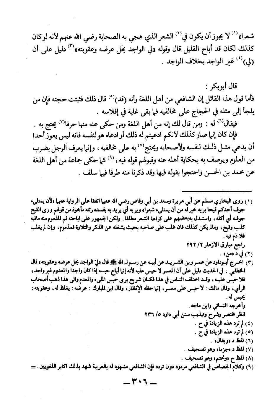 شِعْرًا» لَا يَجُوزُ أَنْ يَكُونَ فِي الشِّعْرِ الَّذِي هَجَى بِهِ الصَّحَابَةُ - رَضِيَ اللَّهُ عَنْهُمْ - لِأَنَّهُ لَوْ كَانَ كَذَلِكَ لَكَانَ قَدْ أَبَاحَ الْقَلِيلَ قَالَ وَقَوْلُهُ «لَيُّ الْوَاجِدُ يُحِلُّ عِرْضَهُ وَعُقُوبَتَهُ» دَلِيلٌ عَلَى أَنَّ (لَيَّ) غَيْرِ الْوَاجِدِ بِخِلَافِ الْوَاجِدِ. قَالَ أَبُو بَكْرٍ: فَأَمَّا قَوْلُ هَذَا الْقَائِلِ إنَّ الشَّافِعِيَّ مِنْ أَهْلِ اللُّغَةِ وَأَنَّهُ (قَدْ) قَالَ ذَلِكَ فَثَبَتَتْ حُجَّتُهُ فَإِنْ مَنْ يَلْجَأُ إلَى مِثْلِهِ فِي الْحِجَاجِ عَلَى مُخَالِفِيهِ فَمَا بَقِيَ غَايَةٌ فِي إفْلَاسِهِ. فَيُقَالُ لَهُ: وَمَنْ قَالَ لَك إنَّهُ مِنْ أَهْلِ اللُّغَةِ وَمَنْ حَكَى عَنْهُ مِنْهَا حَرْفًا يُحْتَجُّ بِهِ. فَإِنْ كَانَ إنَّمَا صَارَ كَذَلِكَ لِأَنَّكُمْ ادَّعَيْتُمْ لَهُ ذَلِكَ أَوْ ادَّعَاهُ هُوَ لِنَفْسِهِ فَإِنَّهُ لَيْسَ يَعُوزُ أَحَدًا أَنْ يَدَّعِيَ مِثْلَ ذَلِكَ لِنَفْسِهِ وَلِأَصْحَابِهِ وَيَحْتَجَّ بِهِ عَلَى مُخَالِفِيهِ، وَإِنَّمَا يُعْرَفُ الرَّجُلُ بِضَرْبٍ مِنْ الْعُلُومِ وَيُوصَفُ بِهِ بِحِكَايَةِ أَهْلِهِ عَنْهُ وَقَبُولِهِمْ قَوْلَهُ فِيهِ، كَمَا حَكَى جَمَاعَةٌ مِنْ أَهْلِ اللُّغَةِ عَنْ مُحَمَّدِ بْنِ الْحَسَنِ وَاحْتَجُّوا بِقَوْلِهِ فِيهَا وَقَدْ ذَكَرْنَا مِنْهُ طَرَفًا فِيمَا سَلَفَ.