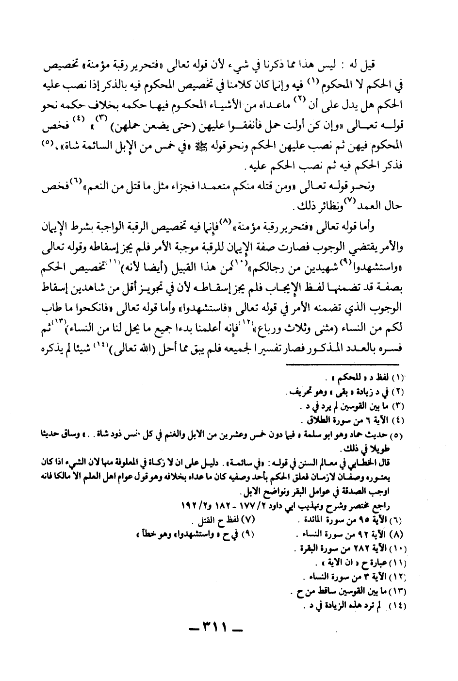 وَأَمَّا قَوْله تَعَالَى {فَتَحْرِيرُ رَقَبَةٍ مُؤْمِنَةٍ} [النساء: 92] فَإِنَّمَا فِيهِ تَخْصِيصُ الرَّقَبَةِ الْوَاجِبَةِ بِشَرْطِ الْإِيمَانِ وَالْأَمْرُ يَقْتَضِي الْوُجُوبَ فَصَارَتْ صِفَةُ الْإِيمَانِ لِلرَّقَبَةِ مُوجَبَةَ الْأَمْرِ فَلَمْ يَجُزْ إسْقَاطُهُ وقَوْله تَعَالَى {وَاسْتَشْهِدُوا شَهِيدَيْنِ مِنْ رِجَالِكُمْ} [البقرة: 282] مِنْ هَذَا الْقَبِيلِ (أَيْضًا لِأَنَّهُ) تَخْصِيصُ الْحُكْمِ بِصِفَةٍ قَدْ تَضَمَّنَهَا لَفْظُ الْإِيجَابِ فَلَمْ يَجُزْ إسْقَاطُهُ لِأَنَّ فِي تَجْوِيزِ أَقَلِّ مِنْ شَاهِدَيْنِ إسْقَاطُ الْوُجُوبِ الَّذِي تَضَمَّنَهُ الْأَمْرُ فِي قَوْله تَعَالَى {فَاسْتَشْهِدُوا} [النساء: 15] وَأَمَّا قَوْله تَعَالَى {فَانْكِحُوا مَا طَابَ لَكُمْ مِنْ النِّسَاءِ مَثْنَى وَثُلَاثَ وَرُبَاعَ} [النساء: 3] فَإِنَّهُ أَعْلَمَنَا بَدْءًا جَمِيعَ مَا يَحِلُّ لَنَا مِنْ النِّسَاءِ ثُمَّ فَسَّرَهُ بِالْعَدَدِ الْمَذْكُورِ فَصَارَ تَفْسِيرًا لِجَمِيعِهِ فَلَمْ يَبْقَ مِمَّا أَحَلَّ (اللَّهُ تَعَالَى) شَيْئًا لَمْ يَذْكُرْهُ