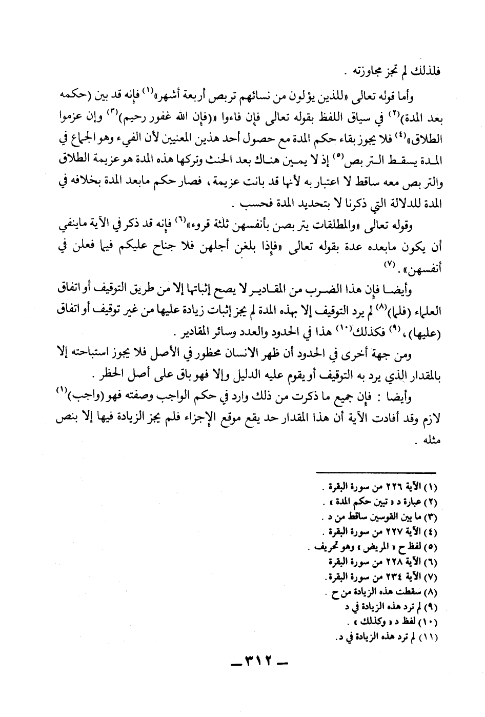 وَأَمَّا قَوْله تَعَالَى {لِلَّذِينَ يُؤْلُونَ مِنْ نِسَائِهِمْ تَرَبُّصُ أَرْبَعَةِ أَشْهُرٍ} [البقرة: 226] فَإِنَّهُ قَدْ بَيَّنَ (حُكْمَهُ بَعْدَ الْمُدَّةِ) فِي سِيَاقِ اللَّفْظِ بِقَوْلِهِ تَعَالَى {فَإِنْ فَاءُوا فَإِنَّ اللَّهَ غَفُورٌ رَحِيمٌ} [البقرة: 226] {وَإِنْ عَزَمُوا الطَّلاقَ} [البقرة: 227] فَلَا يَجُوزُ بَقَاءُ حُكْمِ الْمُدَّةِ مَعَ حُصُولِ أَحَدِ هَذَيْنِ الْمَعْنَيَيْنِ لِأَنَّ الْفَيْءَ وَهُوَ الْجِمَاعُ فِي الْمُدَّةِ يُسْقِطُ التَّرَبُّصَ إذْ لَا يَمِينَ هُنَاكَ بَعْدَ الْحِنْثِ وَتَرْكُهَا هَذِهِ الْمُدَّةَ هُوَ عَزِيمَةُ الطَّلَاقِ وَالتَّرَبُّصُ مَعَهُ سَاقِطٌ لَا اعْتِبَارَ بِهِ لِأَنَّهَا قَدْ بَانَتْ عَزِيمَةً، فَصَارَ حُكْمُ مَا بَعْدَ الْمُدَّةِ بِخِلَافِهِ فِي الْمُدَّةِ لِلدَّلَالَةِ الَّتِي ذَكَرْنَا لَا بِتَحْدِيدِ الْمُدَّةِ فَحَسْبُ. وقَوْله تَعَالَى {وَالْمُطَلَّقَاتُ يَتَرَبَّصْنَ بِأَنْفُسِهِنَّ ثَلَاثَةَ قُرُوءٍ} [البقرة: 228] فَإِنَّهُ قَدْ ذَكَرَ فِي الْآيَةِ مَا يَنْفِي أَنْ يَكُونَ مَا بَعْدَهُ عِدَّةً لِقَوْلِهِ تَعَالَى {فَإِذَا بَلَغْنَ أَجَلَهُنَّ فَلَا جُنَاحَ عَلَيْكُمْ فِيمَا فَعَلْنَ فِي أَنْفُسِهِنَّ} [البقرة: 234] . وَأَيْضًا فَإِنَّ هَذَا الضَّرْبَ مِنْ الْمَقَادِيرِ لَا يَصِحُّ إثْبَاتُهَا إلَّا مِنْ طَرِيقِ التَّوْقِيفِ أَوْ اتِّفَاقِ الْعُلَمَاءِ (فَلَمَّا) لَمْ يَرِدْ التَّوْقِيفُ إلَّا بِهَذِهِ الْمُدَّةِ لَمْ يَجُزْ إثْبَاتُ زِيَادَةٍ عَلَيْهَا مِنْ غَيْرِ تَوْقِيفٍ أَوْ اتِّفَاقٍ (عَلَيْهَا) ، فَكَذَلِكَ هَذَا فِي الْحُدُودِ وَالْعَدَدِ وَسَائِرِ الْمَقَادِيرِ. وَمِنْ جِهَةٍ أُخْرَى فِي الْحُدُودِ أَنَّ ظَهْرَ الْإِنْسَانِ مَحْظُورٌ فِي الْأَصْلِ فَلَا يَجُوزُ اسْتِبَاحَتُهُ إلَّا بِالْمِقْدَارِ الَّذِي يَرِدُ بِهِ التَّوْقِيفُ أَوْ يَقُومُ عَلَيْهِ الدَّلِيلُ وَإِلَّا فَهُوَ بَاقٍ عَلَى أَصْلِ الْحَظْرِ. وَأَيْضًا: فَإِنَّ جَمِيعَ مَا ذَكَرْت مِنْ ذَلِكَ وَارِدٌ فِي حُكْمِ الْوَاجِبِ وَصِفَتِهِ فَهُوَ (وَاجِبٌ) لَازِمٌ وَقَدْ أَفَادَتْ الْآيَةُ أَنَّ هَذَا الْمِقْدَارَ حَدٌّ يَقَعُ مَوْقِعَ الْإِجْزَاءِ فَلَمْ يَجُزْ الزِّيَادَةُ فِيهَا إلَّا بِنَصٍّ مِثْلِهِ.