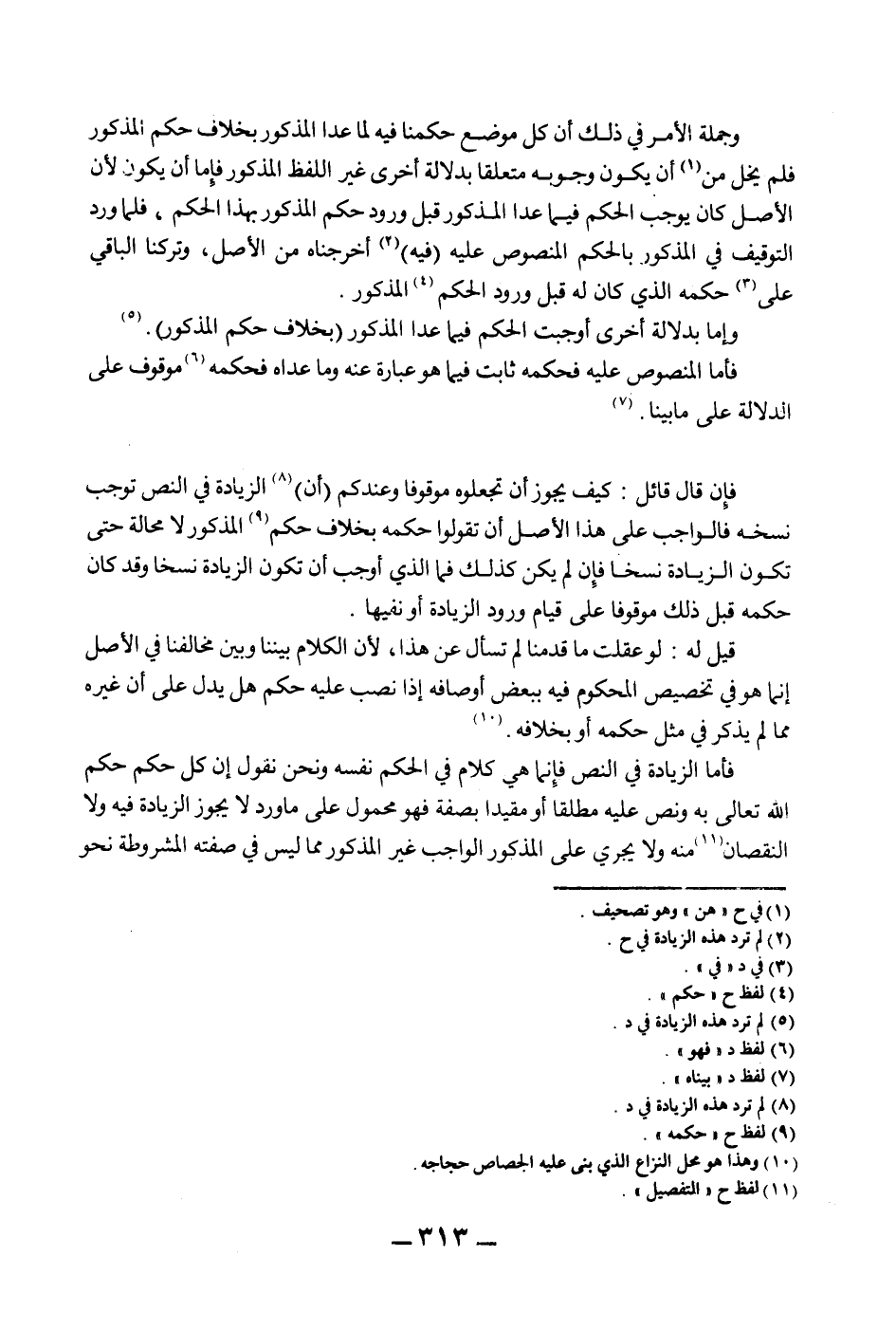 قِيلَ لَهُ: لَوْ عَقَلْت مَا قَدَّمْنَا لَمْ تَسْأَلْ عَنْ هَذَا؛ لِأَنَّ الْكَلَامَ بَيْنَنَا وَبَيْنَ مُخَالِفِنَا فِي الْأَصْلِ إنَّمَا هُوَ فِي تَخْصِيصِ الْمَحْكُومِ فِيهِ بِبَعْضِ أَوْصَافِهِ إذَا نُصِبَ عَلَيْهِ حُكْمٌ هَلْ يَدُلُّ عَلَى أَنَّ غَيْرَهُ مِمَّا لَمْ يُذْكَرْ فِي مِثْلِ حُكْمِهِ أَوْ بِخِلَافِهِ. فَأَمَّا الزِّيَادَةُ فِي النَّصِّ فَإِنَّمَا هِيَ كَلَامٌ فِي الْحُكْمِ نَفْسِهِ وَنَحْنُ نَقُولُ إنَّ كُلَّ حُكْمٍ حَكَمَ اللَّهُ تَعَالَى بِهِ وَنَصَّ عَلَيْهِ مُطْلَقًا أَوْ مُقَيَّدًا بِصِفَةٍ فَهُوَ مَحْمُولٌ عَلَى مَا وَرَدَ لَا يَجُوزُ الزِّيَادَةُ فِيهِ وَلَا النُّقْصَانُ مِنْهُ وَلَا يَجْرِي عَلَى الْمَذْكُورِ الْوَاجِبِ غَيْرُ الْمَذْكُورِ مِمَّا لَيْسَ فِي صِفَتِهِ الْمَشْرُوطَةِ نَحْوُ