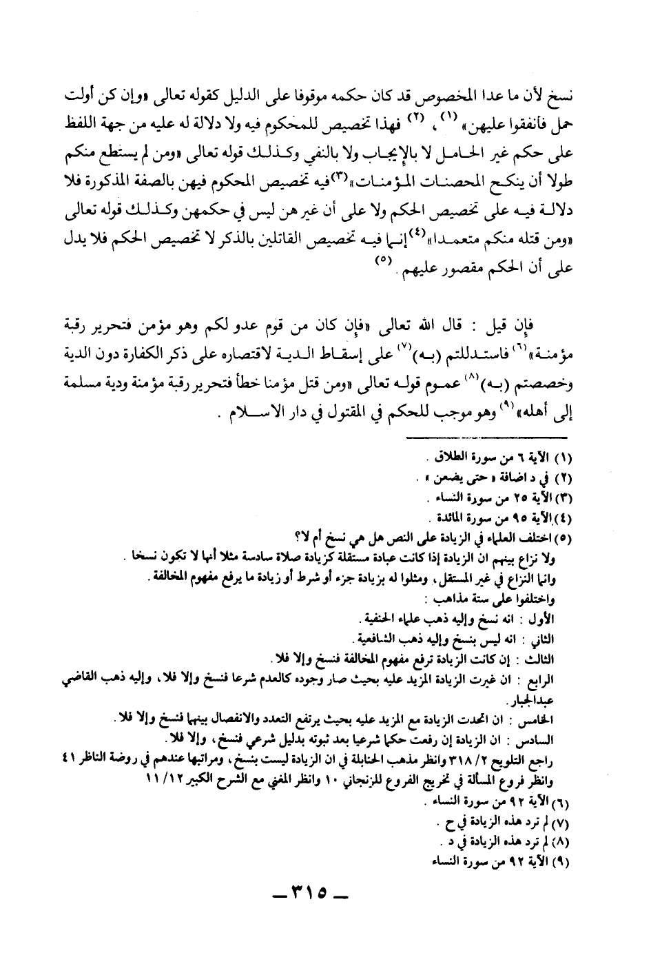 وَكَذَلِكَ قَوْله تَعَالَى {وَمَنْ لَمْ يَسْتَطِعْ مِنْكُمْ طَوْلًا أَنْ يَنْكِحَ الْمُحْصَنَاتِ الْمُؤْمِنَاتِ} [النساء: 25] فِيهِ تَخْصِيصُ الْمَحْكُومِ فِيهِنَّ بِالصِّفَةِ الْمَذْكُورَةِ فَلَا دَلَالَةَ فِيهِ عَلَى تَخْصِيصِ الْحُكْمِ، وَلَا عَلَى أَنَّ غَيْرَهُنَّ لَيْسَ فِي حُكْمِهِنَّ وَكَذَلِكَ قَوْله تَعَالَى {وَمَنْ قَتَلَهُ مِنْكُمْ مُتَعَمِّدًا} [المائدة: 95] إنَّمَا فِيهِ تَخْصِيصُ الْقَاتِلِينَ بِالذِّكْرِ لَا تَخْصِيصُ الْحُكْمِ فَلَا يَدُلُّ عَلَى أَنَّ الْحُكْمَ مَقْصُورٌ عَلَيْهِمْ فَإِنْ قِيلَ: قَالَ اللَّهُ تَعَالَى {فَإِنْ كَانَ مِنْ قَوْمٍ عَدُوٍّ لَكُمْ وَهُوَ مُؤْمِنٌ فَتَحْرِيرُ رَقَبَةٍ مُؤْمِنَةٍ} [النساء: 92] فَاسْتَدْلَلْتُمْ (بِهِ) عَلَى إسْقَاطِ الدِّيَةِ لِاقْتِصَارِهِ عَلَى ذِكْرِ الْكَفَّارَةِ دُونَ الدِّيَةِ وَخَصَصْتُمْ (بِهِ) عُمُومَ قَوْله تَعَالَى {وَمَنْ قَتَلَ مُؤْمِنًا خَطَأً فَتَحْرِيرُ رَقَبَةٍ مُؤْمِنَةٍ وَدِيَةٌ مُسَلَّمَةٌ إلَى أَهْلِهِ} [النساء: 92] وَهُوَ مُوجِبٌ لِلْحُكْمِ فِي الْمَقْتُولِ فِي دَارِ الْإِسْلَامِ.