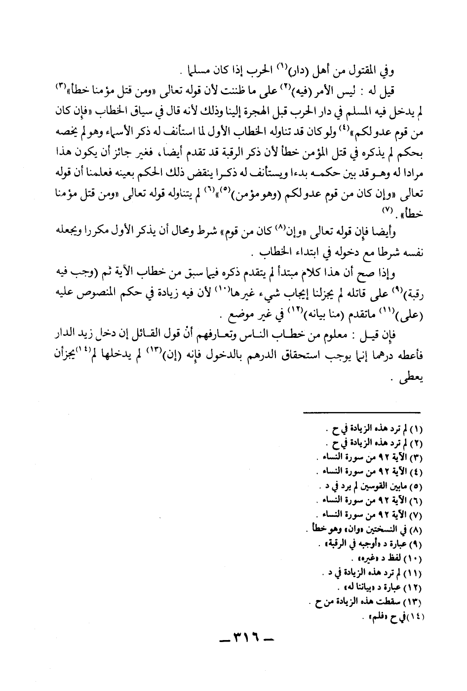 وَفِي الْمَقْتُولِ مِنْ أَهْلِ (دَارِ) الْحَرْبِ إذَا كَانَ مُسْلِمًا. قِيلَ لَهُ: لَيْسَ الْأَمْرُ (فِيهِ) عَلَى مَا ظَنَنْت لِأَنَّ قَوْله تَعَالَى {وَمَنْ قَتَلَ مُؤْمِنًا خَطَأً} [النساء: 92] لَمْ يَدْخُلْ فِيهِ الْمُسْلِمُ فِي دَارِ الْحَرْبِ قَبْلَ الْهِجْرَةِ إلَيْنَا وَذَلِكَ لِأَنَّهُ قَالَ فِي سِيَاقِ الْخِطَابِ {فَإِنْ كَانَ مِنْ قَوْمٍ عَدُوٍّ لَكُمْ} [النساء: 92] وَلَوْ كَانَ قَدْ تَنَاوَلَهُ الْخِطَابُ الْأَوَّلُ لَمَا اسْتَأْنَفَ لَهُ ذِكْرَ الْأَسْمَاءِ وَهُوَ لَمْ يَخُصَّهُ بِحُكْمٍ لَمْ يَذْكُرْهُ فِي قَتْلِ الْمُؤْمِنِ خَطَأً لِأَنَّ ذِكْرَ الرَّقَبَةِ قَدْ تَقَدَّمَ أَيْضًا، فَغَيْرُ جَائِزٍ أَنْ يَكُونَ هَذَا مُرَادًا لَهُ وَهُوَ قَدْ بَيَّنَ حُكْمَهُ بَدْءًا وَيَسْتَأْنِفُ لَهُ ذِكْرًا يَنْقُضُ ذَلِكَ الْحُكْمَ بِعَيْنِهِ فَعَلِمْنَا أَنَّ قَوْله تَعَالَى {فَإِنْ كَانَ مِنْ قَوْمٍ عَدُوٍّ لَكُمْ وَهُوَ مُؤْمِنٌ} [النساء: 92] لَمْ يَتَنَاوَلْهُ قَوْله تَعَالَى {وَمَنْ قَتَلَ مُؤْمِنًا خَطَأً} [النساء: 92] وَأَيْضًا فَإِنَّ قَوْله تَعَالَى {وَإِنْ كَانَ مِنْ قَوْمٍ} [النساء: 92] شَرْطٌ وَمُحَالٌ أَنْ يَذْكُرَ الْأَوَّلَ مُكَرَّرًا وَيَجْعَلَهُ نَفْسَهُ شَرْطًا مَعَ دُخُولِهِ فِي ابْتِدَاءِ الْخِطَابِ.