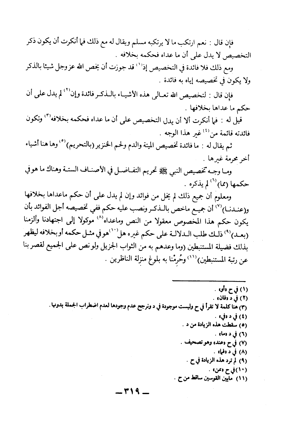 فَإِنْ قَالَ: نَعَمْ ارْتَكَبَ مَا لَا يَرْتَكِبُهُ مُسْلِمٌ وَيُقَالُ لَهُ مَعَ ذَلِكَ فَمَا أَنْكَرْت أَنْ يَكُونَ ذِكْرُ التَّخْصِيصِ لَا يَدُلُّ عَلَى أَنَّ مَا عَدَاهُ فَحُكْمُهُ بِخِلَافِهِ. وَمَعَ ذَلِكَ فَلَا فَائِدَةَ فِي التَّخْصِيصِ إذَا قَدْ جَوَّزْت أَنْ يَخُصَّ اللَّهُ عَزَّ وَجَلَّ شَيْئًا بِالذِّكْرِ، وَلَا يَكُونُ فِي تَخْصِيصِهِ إيَّاهُ بِهِ فَائِدَةٌ. فَإِنْ قَالَ: لِتَخْصِيصِ اللَّهِ تَعَالَى، هَذِهِ الْأَشْيَاءَ بِالذِّكْرِ فَائِدَةٌ، وَإِنْ لَمْ يَدُلَّ عَلَى أَنَّ حُكْمَ مَا عَدَاهَا بِخِلَافِهَا. قِيلَ لَهُ: فَمَا أَنْكَرْت إلَّا أَنْ يَدُلَّ التَّخْصِيصُ عَلَى أَنَّ مَا عَدَاهُ فَحُكْمُهُ بِخِلَافِهِ وَتَكُونُ فَائِدَتُهُ قَائِمَةً مِنْ غَيْرِ هَذَا الْوَجْهِ. ثُمَّ يُقَالُ لَهُ: مَا فَائِدَةُ تَخْصِيصِ الْمَيْتَةِ وَالدَّمِ وَلَحْمِ الْخِنْزِيرِ (بِالتَّحْرِيمِ) وَهَاهُنَا أَشْيَاءُ أُخَرُ مُحَرَّمَةٌ غَيْرُهَا. وَمَا وَجْهُ تَخْصِيصِ النَّبِيِّ - صَلَّى اللَّهُ عَلَيْهِ وَسَلَّمَ - تَحْرِيمَ التَّفَاضُلِ فِي الْأَصْنَافِ السِّتَّةِ وَهَذَا مَا هُوَ فِي حُكْمِهَا (مِمَّا) لَمْ يَذْكُرْهُ. وَمَعْلُومٌ أَنَّ جَمِيعَ ذَلِكَ لَمْ يَخْلُ مِنْ فَوَائِدَ وَإِنْ لَمْ يَدُلَّ عَلَى أَنَّ حُكْمَ مَا عَدَاهَا بِخِلَافِهَا، وَ (عِنْدَنَا) أَنَّ جَمِيعَ مَا خُصَّ بِالذِّكْرِ وَنُصِبَ عَلَيْهِ حُكْمٌ فَفِي تَخْصِيصِهِ أَجَلُّ الْفَوَائِدِ بِأَنْ يَكُونَ حُكْمُ هَذَا الْمَخْصُوصِ مَعْقُولًا مِنْ النَّصِّ وَمَا عَدَاهُ مَوْكُولًا إلَى اجْتِهَادِنَا وَأَلْزَمَنَا (بَعْدَ) ذَلِكَ طَلَبَ الدَّلَالَةِ عَلَى حُكْمٍ غَيْرِهِ هَلْ هُوَ فِي مِثْلِ حُكْمِهِ أَوْ بِخِلَافِهِ لِيَظْهَرَ بِذَلِكَ فَضِيلَةُ الْمُسْتَنْبِطِينَ (وَمَا وَعَدَهُمْ بِهِ مِنْ الثَّوَابِ الْجَزِيلِ وَلَوْ نَصَّ عَلَى الْجَمِيعِ لَقَصَرَ بِنَا عَنْ رُتْبَةِ الْمُسْتَنْبِطِينَ) وَحُرِمْنَا بِهِ بُلُوغَ مَنْزِلَةِ النَّاظِرِينَ.