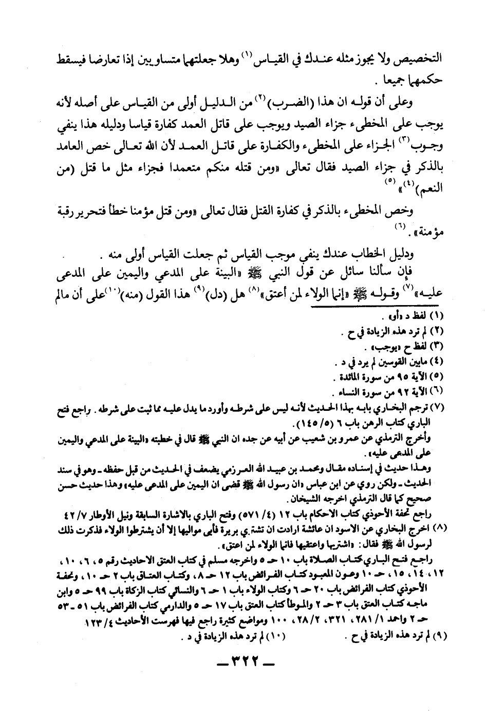 وَعَلَى أَنَّ قَوْلَهُ إنَّ هَذَا (الضَّرْبَ) مِنْ الدَّلِيلِ أَوْلَى مِنْ الْقِيَاسِ عَلَى أَصْلِهِ لِأَنَّهُ يُوجِبُ عَلَى الْمُخْطِئِ جَزَاءَ الصَّيْدِ وَيُوجِبُ عَلَى قَاتِلِ الْعَمْدِ كَفَّارَةً قِيَاسًا وَدَلِيلُهُ هَذَا يَنْفِي وُجُوبَ الْجَزَاءِ عَلَى الْمُخْطِئِ وَالْكَفَّارَةِ عَلَى قَاتِلِ الْعَمْدِ لِأَنَّ اللَّهَ تَعَالَى خَصَّ الْعَامِدَ بِالذِّكْرِ فِي جَزَاءِ الصَّيْدِ فَقَالَ تَعَالَى {وَمَنْ قَتَلَهُ مِنْكُمْ مُتَعَمِّدًا فَجَزَاءٌ مِثْلُ مَا قَتَلَ مِنْ النَّعَمِ} [المائدة: 95] وَخَصَّ الْمُخْطِئَ بِالذَّكَرِ فِي كَفَّارَةِ الْقَتْلِ فَقَالَ تَعَالَى {وَمَنْ قَتَلَ مُؤْمِنًا خَطَأً فَتَحْرِيرُ رَقَبَةٍ مُؤْمِنَةٍ} [النساء: 92] . وَدَلِيلُ الْخِطَابِ عِنْدَك يَنْفِي مُوجَبَ الْقِيَاسِ ثُمَّ جَعَلْت الْقِيَاسِ أَوْلَى مِنْهُ. فَإِنْ سَأَلَنَا سَائِلٌ عَنْ قَوْلِ النَّبِيِّ - صَلَّى اللَّهُ عَلَيْهِ وَسَلَّمَ - «الْبَيِّنَةُ عَلَى الْمُدَّعِي وَالْيَمِينُ عَلَى الْمُدَّعَى عَلَيْهِ» وَقَوْلِهِ - صَلَّى اللَّهُ عَلَيْهِ وَسَلَّمَ - «إنَّمَا الْوَلَاءُ لِمَنْ أَعْتَقَ» هَلْ (دَلَّ) هَذَا الْقَوْلُ (مِنْهُ) عَلَى أَنَّ مَا لَمْ