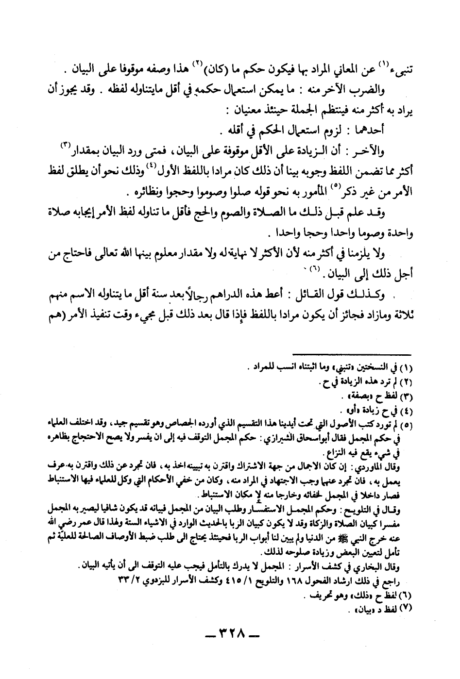 وَالضَّرْبُ الْآخَرُ مِنْهُ: مَا يُمْكِنُ اسْتِعْمَالُ حُكْمِهِ فِي أَقَلِّ مَا يَتَنَاوَلُهُ لَفْظُهُ. وَقَدْ يَجُوزُ أَنْ يُرَادَ بِهِ أَكْثَرُ مِنْهُ فَيَنْتَظِمَ الْجُمْلَةَ حِينَئِذٍ مَعْنَيَانِ: أَحَدُهُمَا: لُزُومُ اسْتِعْمَالِ الْحُكْمِ فِي أَقَلِّهِ. وَالْآخَرُ: أَنَّ الزِّيَادَةَ عَلَى الْأَقَلِّ مَوْقُوفَةٌ عَلَى الْبَيَانِ، فَمَتَى وَرَدَ الْبَيَانُ بِمِقْدَارٍ أَكْثَرَ مِمَّا تَضَمَّنَ اللَّفْظُ وُجُوبَهُ بَيَّنَّا أَنَّ ذَلِكَ كَانَ مُرَادًا بِاللَّفْظِ الْأَوَّلِ وَذَلِكَ نَحْوُ أَنْ يُطْلَقَ لَفْظُ الْأَمْرِ مِنْ غَيْرِ ذِكْرِ الْمَأْمُورِ بِهِ نَحْوُ قَوْلِهِ صَلُّوا وَصُومُوا وَحُجُّوا وَنَظَائِرِهِ. وَقَدْ عُلِمَ قَبْلَ ذَلِكَ مَا الصَّلَاةُ وَالصَّوْمُ وَالْحَجُّ فَأَقَلُّ مَا تَنَاوَلَهُ لَفْظُ الْأَمْرِ إيجَابَهُ صَلَاةً وَاحِدَةً وَصَوْمًا وَاحِدًا وَحَجًّا وَاحِدًا.