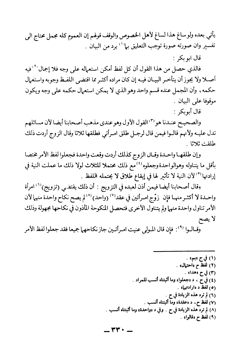 يَأْتِي بَعْدَهُ وَلَوْ سَاغَ هَذَا لَسَاغَ لِأَهْلِ الْخُصُوصِ وَالْوَقْفِ قَوْلُهُمْ إنَّ الْعُمُومَ كُلَّهُ مُجْمَلٌ مُحْتَاجٌ إلَى تَفْسِيرٍ وَإِنَّ صُورَتَهُ صُورَةٌ تُوجِبُ التَّعْلِيقَ بِمَا، يَرِدُ مِنْ الْبَيَانِ. قَالَ أَبُو بَكْرٍ: فَاَلَّذِي حَصَلَ مِنْ هَذَا الْقَوْلِ أَنَّ كُلَّ لَفْظٍ أَمْكَنَ اسْتِعْمَالُهُ عَلَى وَجْهٍ فَلَا إجْمَالَ فِيهِ أَصْلًا وَلَا يَجُوزُ أَنْ يَتَأَخَّرَ الْبَيَانُ فِيهِ إنْ كَانَ مُرَادُهُ أَكْثَرَ مِمَّا اقْتَضَى اللَّفْظُ وُجُوبَهُ وَاسْتِعْمَالَ حُكْمِهِ، وَأَنَّ الْمُجْمَلَ عِنْدَهُ قِسْمٌ وَاحِدٌ وَهُوَ الَّذِي لَا يُمْكِنُ اسْتِعْمَالُ حُكْمِهِ عَلَى وَجْهٍ وَيَكُونُ مَوْقُوفًا عَلَى الْبَيَانِ. قَالَ أَبُو بَكْرٍ: وَالصَّحِيحُ عِنْدَنَا هُوَ الْقَوْلُ الْأَوَّلُ وَهُوَ عِنْدِي مَذْهَبُ أَصْحَابِنَا أَيْضًا؛ لِأَنَّ مَسَائِلَهُمْ تَدُلُّ عَلَيْهِ وَلِأَنَّهُمْ قَالُوا فِيمَنْ قَالَ لِرَجُلٍ طَلِّقْ امْرَأَتِي فَطَلَّقَهَا ثَلَاثًا وَقَالَ الزَّوْجُ أَرَدْت ذَلِكَ طَلُقَتْ ثَلَاثًا. وَإِنْ طَلَّقَهَا وَاحِدَةً وَقَالَ الزَّوْجُ كَذَلِكَ أَرَدْت وَقَعَتْ وَاحِدَةً فَجَعَلُوا لَفْظَ الْأَمْرِ مُخْتَصًّا بِأَقَلِّ مَا يَتَنَاوَلُهُ وَهُوَ الْوَاحِدَةُ وَجَعَلُوهُ مَعَ ذَلِكَ مُحْتَمِلًا لِلثَّلَاثِ لَوْلَا ذَلِكَ مَا عَمِلَتْ النِّيَّةُ فِي إرَادَتِهَا لِأَنَّ النِّيَّةَ لَا تَأْثِيرَ لَهَا فِي إيقَاعِ طَلَاقٍ لَا يَحْتَمِلُهُ اللَّفْظُ.