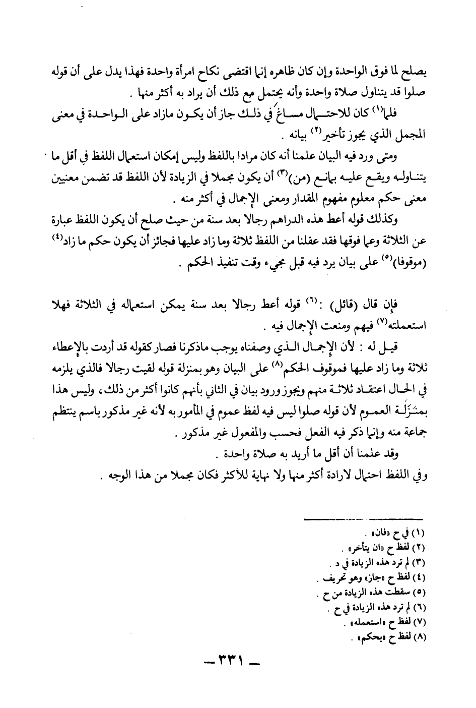 وَمَتَى وَرَدَ فِيهِ الْبَيَانُ عَلِمْنَا أَنَّهُ كَانَ مُرَادًا بِاللَّفْظِ وَلَيْسَ إمْكَانُ اسْتِعْمَالِ اللَّفْظِ فِي أَقَلِّ مَا يَتَنَاوَلُهُ وَيَقَعُ عَلَيْهِ بِمَانِعٍ (مِنْ) أَنْ يَكُونَ مُجْمَلًا فِي الزِّيَادَةِ لِأَنَّ اللَّفْظَ قَدْ تَضَمَّنَ مَعْنَيَيْنِ مَعْنَى حُكْمٍ مَعْلُومٍ مَفْهُومِ الْمِقْدَارِ وَمَعْنَى الْإِجْمَالِ فِي أَكْثَرَ مِنْهُ. وَكَذَلِكَ قَوْلُهُ أَعْطِ هَذِهِ الدَّرَاهِمَ رِجَالًا بَعْدَ سَنَةٍ مِنْ حَيْثُ صَلُحَ أَنْ يَكُونَ اللَّفْظُ عِبَارَةً عَنْ الثَّلَاثَةِ وَعَمَّا فَوْقَهَا فَقَدْ عَقَلْنَا مِنْ اللَّفْظِ ثَلَاثَةً وَمَا زَادَ عَلَيْهَا فَجَائِزٌ أَنْ يَكُونَ حُكْمُ مَا زَادَ (مَوْقُوفًا) عَلَى بَيَانٍ يَرِدُ فِيهِ قَبْلَ مَجِيءِ وَقْتِ تَنْفِيذِ الْحُكْمِ.