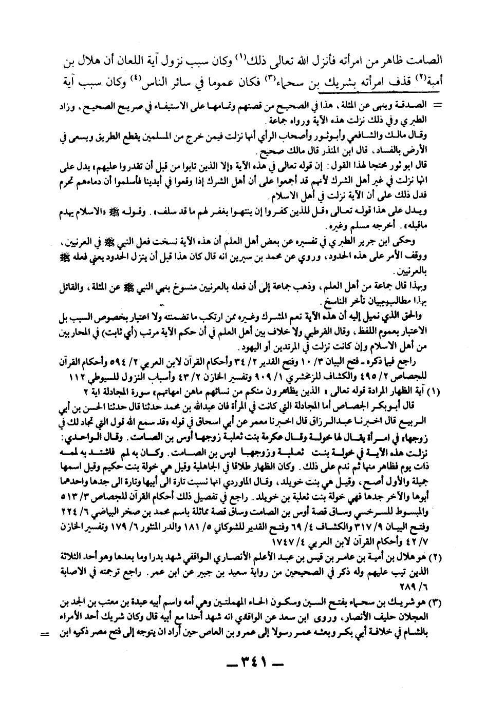 ظَاهَرَ مِنْ امْرَأَتِهِ فَأَنْزَلَ اللَّهُ تَعَالَى ذَلِكَ وَكَانَ سَبَبُ نُزُولِ آيَةِ اللِّعَانِ أَنَّ هِلَالَ بْنَ أُمَيَّةَ قَذَفَ امْرَأَتَهُ بِشَرِيكِ ابْنِ سَحْمَاءَ فَكَانَ عُمُومًا فِي سَائِرِ النَّاسِ وَكَانَ سَبَبُ آيَةِ