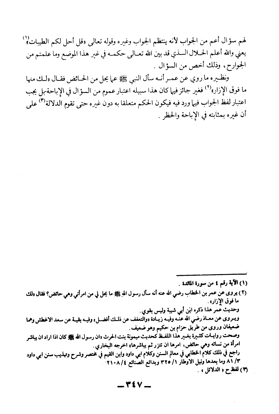 لَهُمْ سُؤَالٌ أَعَمُّ مِنْ الْجَوَابِ لِأَنَّهُ يَنْتَظِمُ الْجَوَابَ وَغَيْرَهُ وقَوْله تَعَالَى: {قُلْ أُحِلَّ لَكُمْ الطَّيِّبَاتُ} [المائدة: 4] يَعْنِي - وَاَللَّهُ أَعْلَمُ - الْحَلَالَ الَّذِي قَدْ بَيَّنَ اللَّهُ تَعَالَى حُكْمَهُ فِي غَيْرِ هَذَا الْمَوْضِعِ {وَمَا عَلَّمْتُمْ مِنْ الْجَوَارِحِ} [المائدة: 4] ، وَذَلِكَ أَخَصُّ مِنْ السُّؤَالِ. وَنَظِيرُهُ مَا رُوِيَ عَنْ «عُمَرَ أَنَّهُ سَأَلَ النَّبِيَّ - صَلَّى اللَّهُ عَلَيْهِ وَسَلَّمَ - عَمَّا يَحِلُّ مِنْ الْحَائِضِ فَقَالَ لَك مِنْهَا مَا فَوْقَ الْإِزَارِ» فَغَيْرُ جَائِزٍ فِيمَا كَانَ هَذَا سَبِيلَهُ اعْتِبَارُ عُمُومٍ مِنْ السُّؤَالِ فِي الْإِبَاحَةِ بَلْ يَجِبُ اعْتِبَارُ لَفْظِ الْجَوَابِ فِيمَا وَرَدَ فِيهِ فَيَكُونُ الْحُكْمُ مُتَعَلِّقًا بِهِ دُونَ غَيْرِهِ حَتَّى تَقُومَ الدَّلَالَةُ عَلَى أَنَّ غَيْرَهُ بِمَثَابَتِهِ فِي الْإِبَاحَةِ وَالْحَظْرِ.