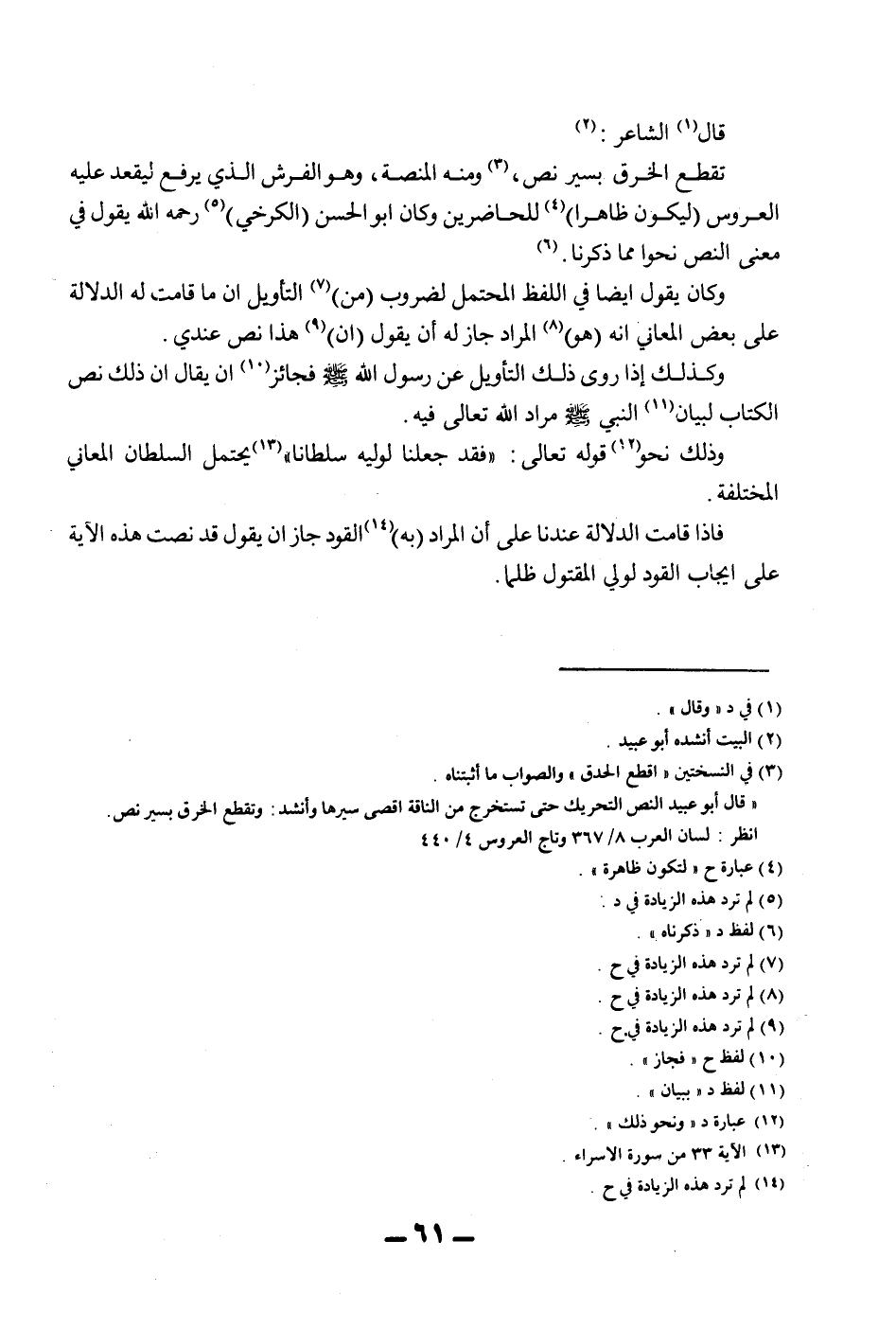 ، وَمِنْهُ الْمِنَصَّةُ، وَهُوَ الْفَرْشُ الَّذِي يُرْفَعُ لِيَقْعُدَ عَلَيْهِ الْعَرُوسُ (لِيَكُونَ ظَاهِرًا) لِلْحَاضِرَيْنِ، وَكَانَ أَبُو الْحَسَنِ الْكَرْخِيُّ - رَحِمَهُ اللَّهُ - يَقُولُ فِي مَعْنَى النَّصِّ نَحْوًا مِمَّا ذَكَرْنَا. وَكَانَ يَقُولُ أَيْضًا فِي اللَّفْظِ الْمُحْتَمِلِ لِضُرُوبٍ (مِنْ) التَّأْوِيلِ أَنَّ مَا قَامَتْ لَهُ الدَّلَالَةُ عَلَى بَعْضِ الْمَعَانِي أَنَّهُ (هُوَ) الْمُرَادُ جَازَ لَهُ أَنْ يَقُولَ (إنَّ) هَذَا نَصٌّ عِنْدِي، وَكَذَلِكَ إذَا رَوَى ذَلِكَ التَّأْوِيلَ عَنْ رَسُولِ اللَّهِ - صَلَّى اللَّهُ عَلَيْهِ وَسَلَّمَ - فَجَائِزٌ أَنْ يُقَالَ إنَّ ذَلِكَ نَصُّ الْكِتَابِ لِبَيَانِ النَّبِيِّ - صَلَّى اللَّهُ عَلَيْهِ وَسَلَّمَ - مُرَادَ اللَّهِ تَعَالَى فِيهِ. وَذَلِكَ نَحْوُ قَوْله تَعَالَى: {فَقَدْ جَعَلْنَا لِوَلِيِّهِ سُلْطَانًا} [الإسراء: 33] يَحْتَمِلُ السُّلْطَانُ الْمَعَانِيَ الْمُخْتَلِفَةَ. فَإِذَا قَامَتْ الدَّلَالَةُ عِنْدَنَا عَلَى أَنَّ الْمُرَادَ (بِهِ) الْقَوَدُ جَازَ أَنْ يَقُولَ قَدْ نَصَّتْ هَذِهِ الْآيَةُ عَلَى إيجَابِ الْقَوَدِ لِوَلِيِّ الْمَقْتُولِ ظُلْمًا