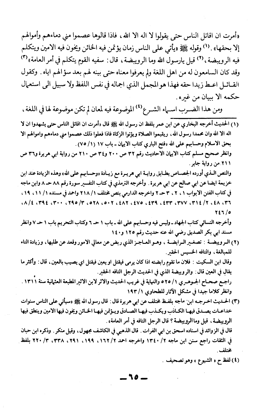 «أُمِرْتُ أَنْ أُقَاتِلَ النَّاسَ حَتَّى يَقُولُوا لَا إلَهَ إلَّا اللَّهُ، فَإِذَا قَالُوهَا عَصَمُوا مِنِّي دِمَاءَهُمْ وَأَمْوَالَهُمْ إلَّا بِحَقِّهَا» . وَقَوْلِهِ - صَلَّى اللَّهُ عَلَيْهِ وَسَلَّمَ - «يَأْتِي عَلَى النَّاسِ زَمَانٌ يُؤْتَمَنُ فِيهِ الْخَائِنُ وَيُخَوَّنُ فِيهِ الْأَمِينُ وَيَتَكَلَّمُ فِيهِ الرُّوَيْبِضَةُ قِيلَ يَا رَسُولَ اللَّهِ وَمَا الرُّوَيْبِضَةُ؟ . قَالَ: سَفِيهُ الْقَوْمِ يَتَكَلَّمُ فِي أَمْرِ الْعَامَّةِ» وَقَدْ كَانَ السَّامِعُونَ لَهُ مِنْ أَهْلِ اللُّغَةِ وَلَمْ يَعْرِفُوا مَعْنَاهُ حَتَّى بَيَّنَهُ لَهُمْ بَعْدَ سُؤَالِهِمْ إيَّاهُ. وَكَقَوْلِ الْقَائِلِ أَعْطِ زَيْدًا حَقَّهُ فَهَذَا هُوَ الْمُجْمَلُ الَّذِي إجْمَالُهُ فِي نَفْسِ اللَّفْظِ وَلَا سَبِيلَ إلَى اسْتِعْمَالِ حُكْمِهِ إلَّا بِبَيَانٍ مِنْ غَيْرِهِ.