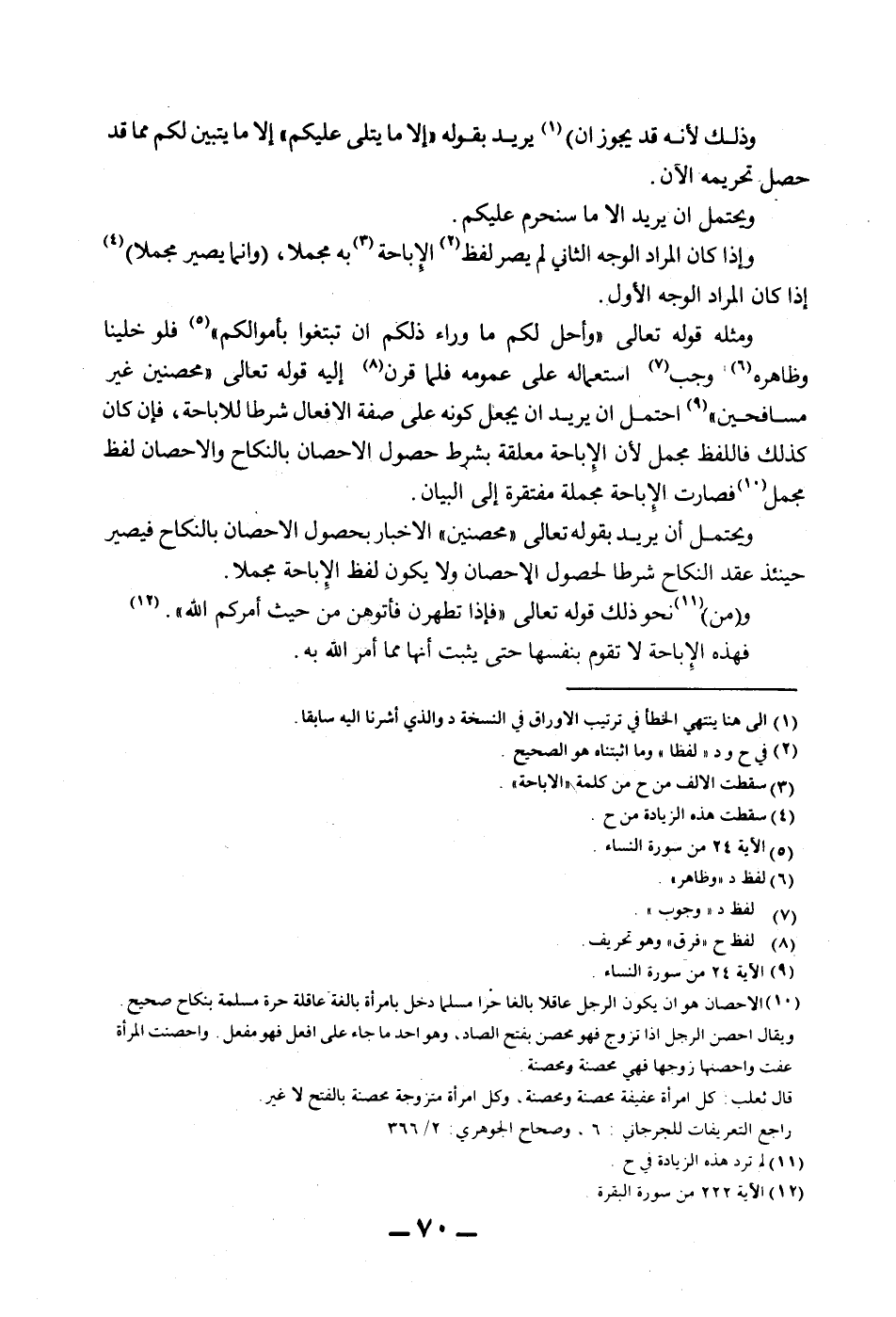 وَذَلِكَ لِأَنَّهُ (قَدْ يَجُوزُ أَنْ) يُرِيدَ بِقَوْلِهِ {إلَّا مَا يُتْلَى عَلَيْكُمْ} [الحج: 30] إلَّا مَا يَتَبَيَّنُ لَكُمْ مِمَّا قَدْ حَصَلَ تَحْرِيمُهُ الْآنَ. وَيَحْتَمِلُ أَنْ يُرِيدَ إلَّا مَا سَنُحَرِّمُ عَلَيْكُمْ. وَإِذَا كَانَ الْمُرَادُ الْوَجْهَ الثَّانِيَ لَمْ يَصِرْ لَفْظُ الْإِبَاحَةِ بِهِ مُجْمَلًا، (وَإِنَّمَا يَصِيرُ مُجْمَلًا) إذَا كَانَ الْمُرَادُ الْوَجْهَ الْأَوَّلَ. وَمِثْلُهُ قَوْله تَعَالَى {وَأُحِلَّ لَكُمْ مَا وَرَاءَ ذَلِكُمْ أَنْ تَبْتَغُوا بِأَمْوَالِكُمْ} [النساء: 24] فَلَوْ خَلَّيْنَا وَظَاهِرَهُ وَجَبَ اسْتِعْمَالُهُ عَلَى عُمُومِهِ فَلَمَّا قَرَنَ إلَيْهِ قَوْله تَعَالَى {مُحْصِنِينَ غَيْرَ مُسَافِحِينَ} [النساء: 24] احْتَمَلَ أَنْ يُرِيدَ أَنْ يَجْعَلَ كَوْنَهُ عَلَى صِفَةِ الْأَفْعَالِ شَرْطًا لِلْإِبَاحَةِ، فَإِنْ كَانَ كَذَلِكَ فَاللَّفْظُ مُجْمَلٌ لِأَنَّ الْإِبَاحَةَ مُعَلَّقَةٌ بِشَرْطِ حُصُولِ الْإِحْصَانِ بِالنِّكَاحِ وَالْإِحْصَانُ لَفْظٌ مُجْمَلٌ فَصَارَتْ الْإِبَاحَةُ مُجْمَلَةً مُفْتَقِرَةً إلَى الْبَيَانِ. وَيَحْتَمِلُ أَنْ يُرِيدَ بِقَوْلِهِ تَعَالَى {مُحْصِنِينَ} [النساء: 24] الْإِخْبَارَ بِحُصُولِ الْإِحْصَانِ بِالنِّكَاحِ فَيَصِيرَ حِينَئِذٍ عَقْدُ النِّكَاحِ شَرْطًا لِحُصُولِ الْإِحْصَانِ وَلَا يَكُونُ لَفْظُ الْإِبَاحَةِ مُجْمَلًا، وَ (مِنْ) نَحْوِ ذَلِكَ قَوْله تَعَالَى {فَإِذَا تَطَهَّرْنَ فَأْتُوهُنَّ مِنْ حَيْثُ أَمَرَكُمْ اللَّهُ} [البقرة: 222] . فَهَذِهِ الْإِبَاحَةُ لَا تَقُومُ بِنَفْسِهَا حَتَّى يَثْبُتَ أَنَّهَا مِمَّا أَمَرَ اللَّهُ بِهِ.