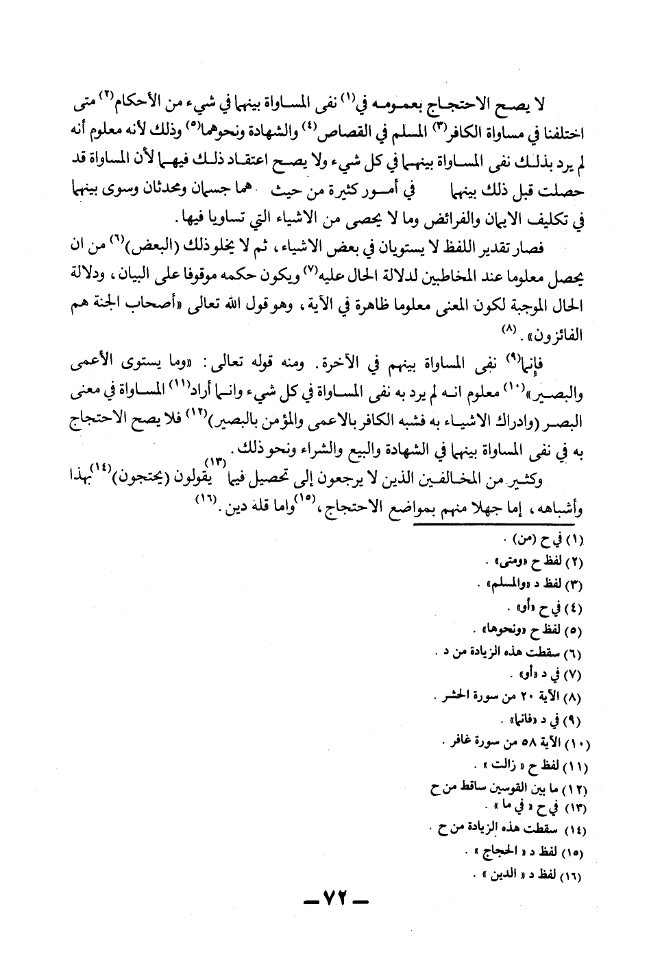 فَصَارَ تَقْدِيرُ اللَّفْظِ لَا يَسْتَوِيَانِ فِي بَعْضِ الْأَشْيَاءِ، ثُمَّ لَا يَخْلُو ذَلِكَ (الْبَعْضُ) مِنْ أَنْ يُحَصِّلَ مَعْلُومًا عِنْدَ الْمُخَاطَبِينَ لِدَلَالَةِ الْحَالِ عَلَيْهِ وَيَكُونُ حُكْمُهُ مَوْقُوفًا عَلَى الْبَيَانِ، وَدَلَالَةُ الْحَالِ الْمُوجِبَةِ لِكَوْنِ الْمَعْنَى مَعْلُومًا ظَاهِرَةٌ فِي الْآيَةِ، وَهُوَ قَوْلُ اللَّهِ تَعَالَى {أَصْحَابُ الْجَنَّةِ هُمْ الْفَائِزُونَ} [الحشر: 20] . فَإِنَّمَا نَفَى الْمُسَاوَاةَ بَيْنَهُمْ فِي الْآخِرَةِ. وَمِنْهُ قَوْله تَعَالَى: {وَمَا يَسْتَوِي الْأَعْمَى وَالْبَصِيرُ} [فاطر: 19] مَعْلُومٌ أَنَّهُ لَمْ يُرِدْ بِهِ نَفْيَ الْمُسَاوَاةِ فِي كُلِّ شَيْءٍ، وَإِنَّمَا أَرَادَ الْمُسَاوَاةَ فِي مَعْنَى الْبَصَرِ (وَإِدْرَاكِ الْأَشْيَاءِ بِهِ فَشَبَّهَ الْكَافِرَ بِالْأَعْمَى وَالْمُؤْمِنَ بِالْبَصِيرِ) فَلَا يَصِحُّ الِاحْتِجَاجُ بِهِ فِي نَفْيِ الْمُسَاوَاةِ بَيْنَهُمَا فِي الشَّهَادَةِ وَالْبَيْعِ وَالشِّرَاءِ وَنَحْوِ ذَلِكَ. وَكَثِيرٌ مِنْ الْمُخَالِفِينَ الَّذِينَ لَا يَرْجِعُونَ إلَى تَحْصِيلٍ فِيمَا يَقُولُونَ (يَحْتَجُّونَ) بِهَذَا وَأَشْبَاهِهِ، إمَّا جَهْلًا مِنْهُمْ بِمَوَاضِعِ الِاحْتِجَاجِ، وَإِمَّا قِلَّةَ دِينٍ.